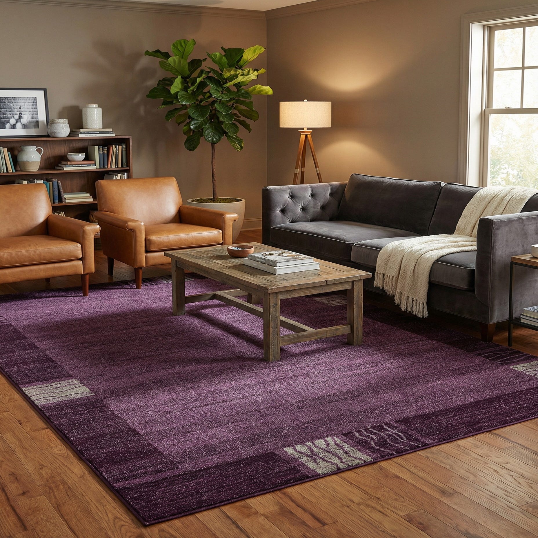 The Angelica collection presents a sophisticated 8x11 area rug, machine woven with 100% polypropylene fibers, offering a balance of durability and visual appeal. This piece showcases a modern gradient pattern that transitions from a rich violet to softer gray tones, creating a sense of depth and dimension. The background of the rug is primarily violet, providing a vibrant yet elegant base that complements the design.