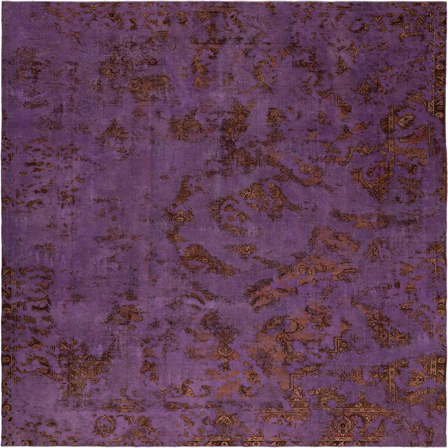 An 8x11 rectangular purple Persian wool rug with a distressed, faded traditional pattern in brown and gold tones.