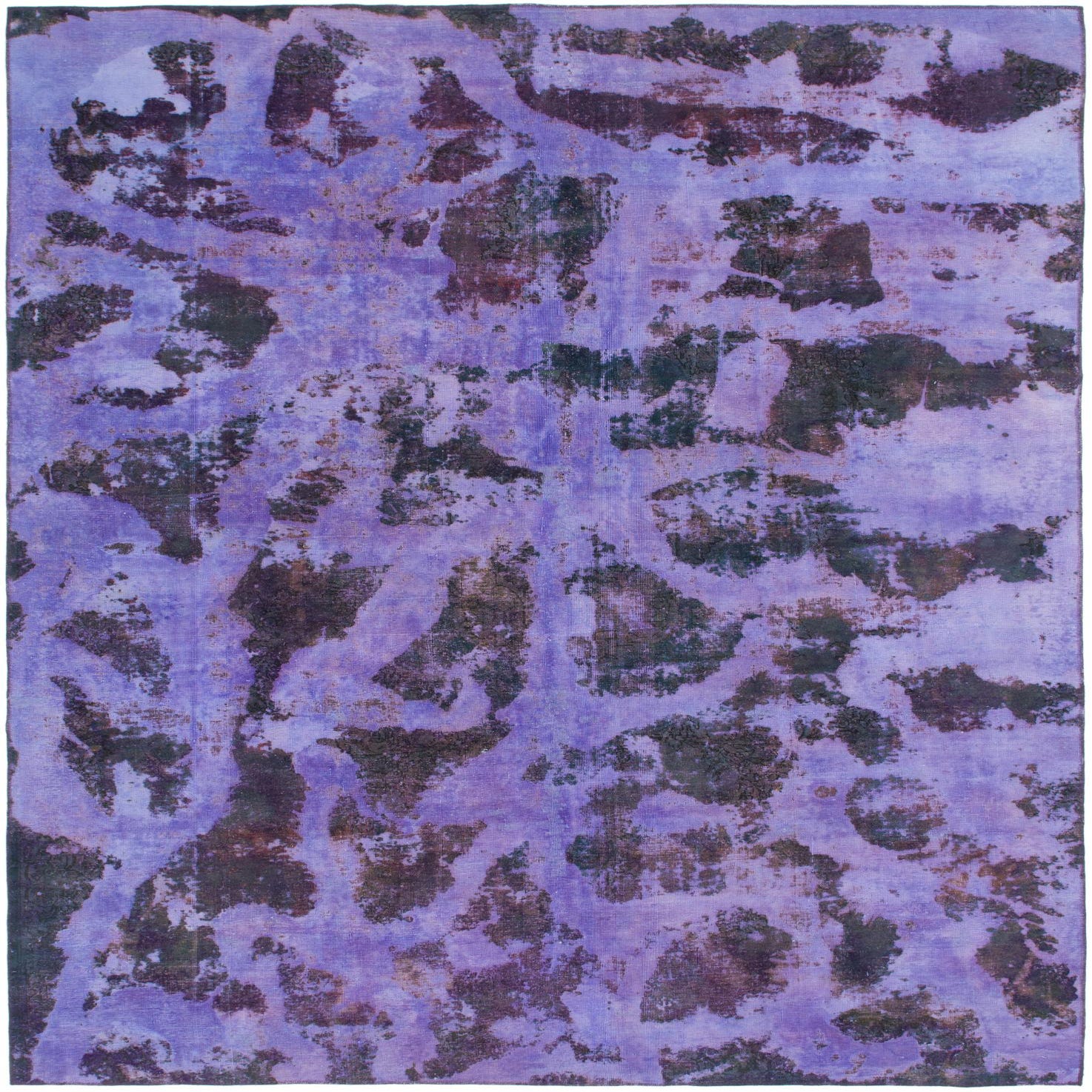 A violet field provides the backdrop for an abstract, painterly composition of black and deep purple blotches, warmed with brown accents and subtle olive highlights. The irregular, distressed pattern has a worn, vintage-washed look that balances bold color with muted depth, creating movement across the surface without a rigid motif.