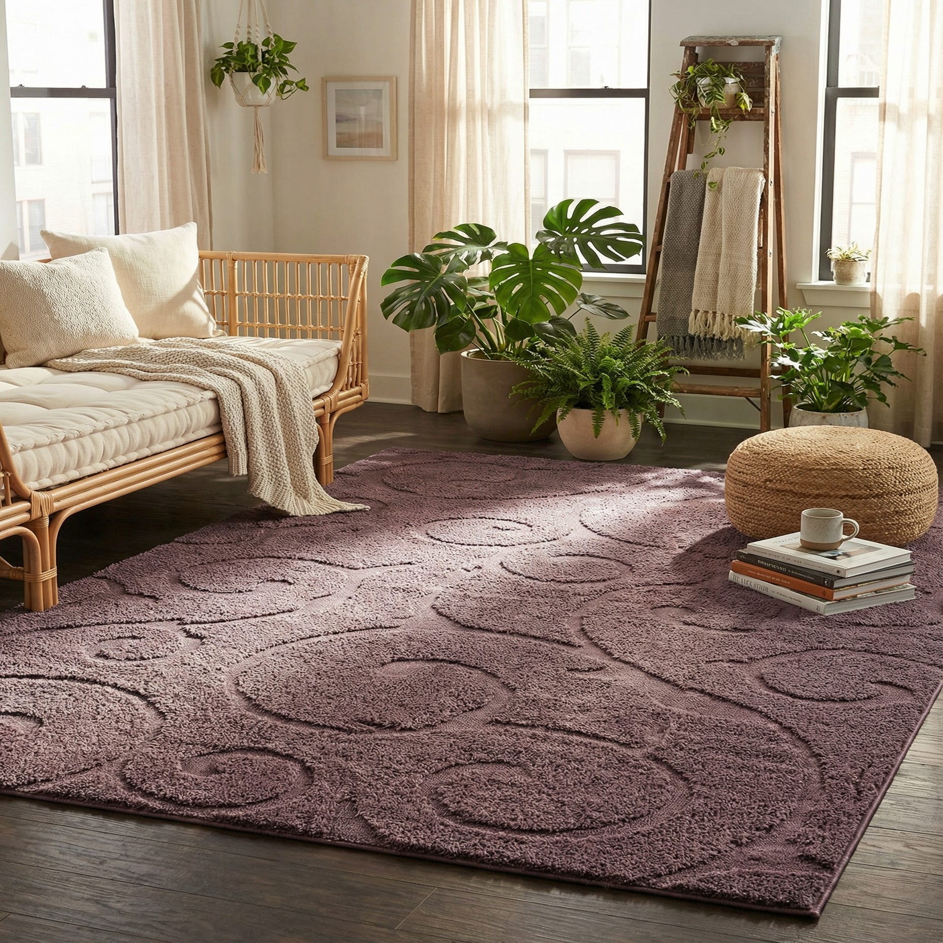 A rich violet field sets the stage for a subtle, tone-on-tone botanical scroll pattern carved into the pile. The design is created by varying pile heights that form soft, rounded vines and spirals across the surface, giving the rug a sculpted look without a busy contrast. Machine made from 100% polyester, the pile has a plush, tactile quality that feels dense and cushiony underfoot, with a gentle sheen that catches light and highlights the raised motif.