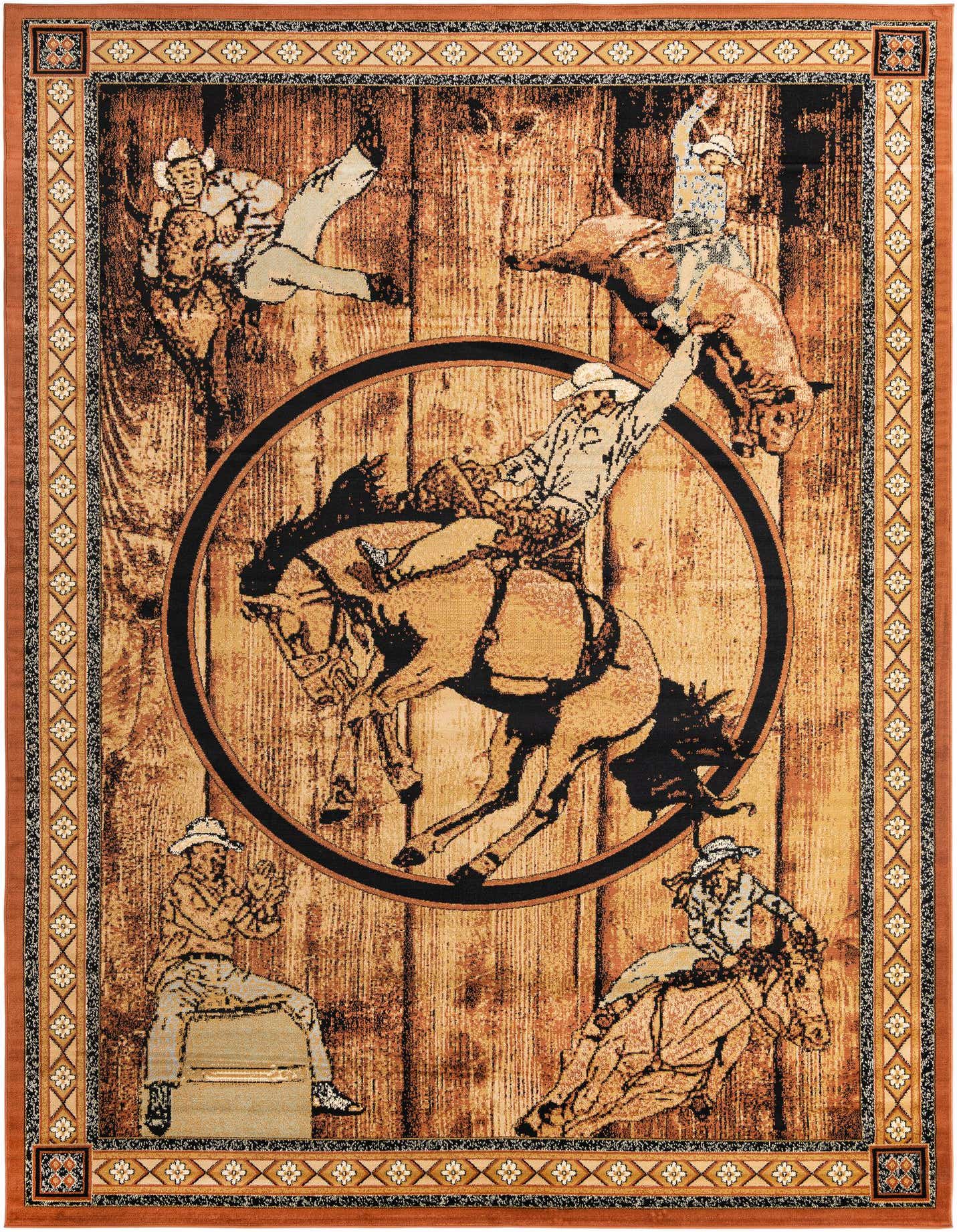 The Pioneer Collection presents a refined 10x14 area rug, machine woven from 100% polypropylene for durability and longevity. This rug offers a harmonious blend of walnut as the principal background color, complemented by accent hues of beige, black, brown, and light blue, creating a warm and inviting palette.