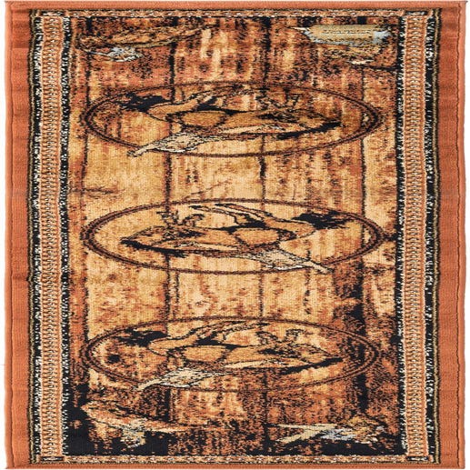 A long 8 ft runner rug with a rustic wood plank pattern in browns and tans, featuring three circular medallions with deer silhouettes, bordered by a thin orange edge.