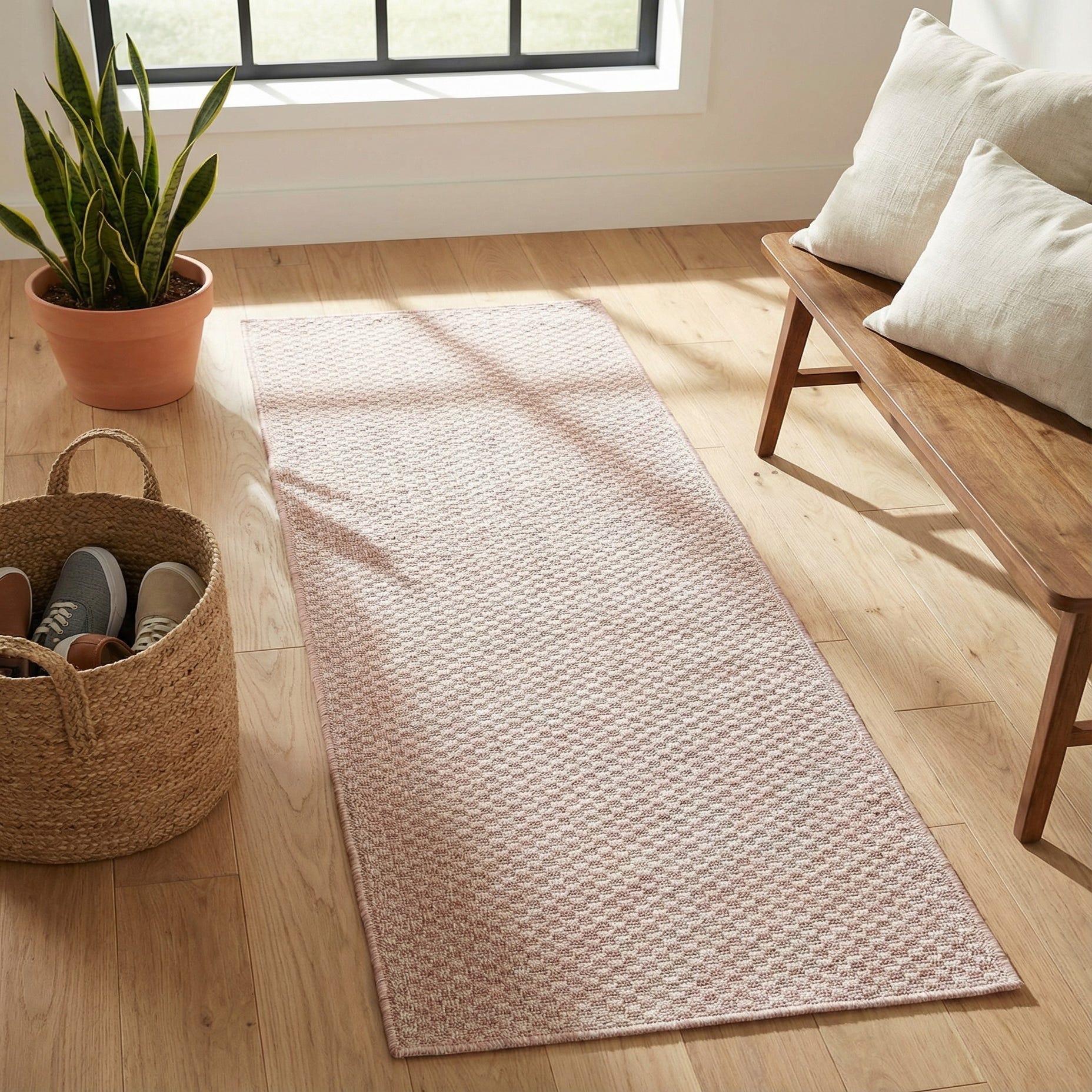 This runner's understated design and gentle color lend it well to a variety of interior design scenarios. It would fit seamlessly in a coastal-inspired setting, a minimalist décor, or even a contemporary outdoor lounge area. The soft pink hue pairs beautifully with neutral tones, allowing for a harmonious integration with existing aesthetics or serving as a foundation for a fresh design palette.