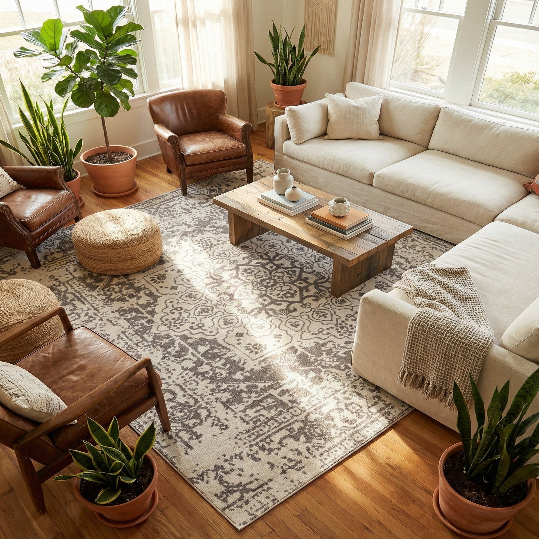 This neutral palette works quietly with a range of interiors — pair it with warm wood furniture and layered textiles for a modern farmhouse or transitional living room, place it under a light-toned dining table to keep the space feeling open, or use it in a bedroom to anchor soft linens and minimalist décor. The subtle pattern provides interest without overwhelming other elements, making it a versatile foundation for contemporary, coastal, or Scandinavian-inspired rooms.