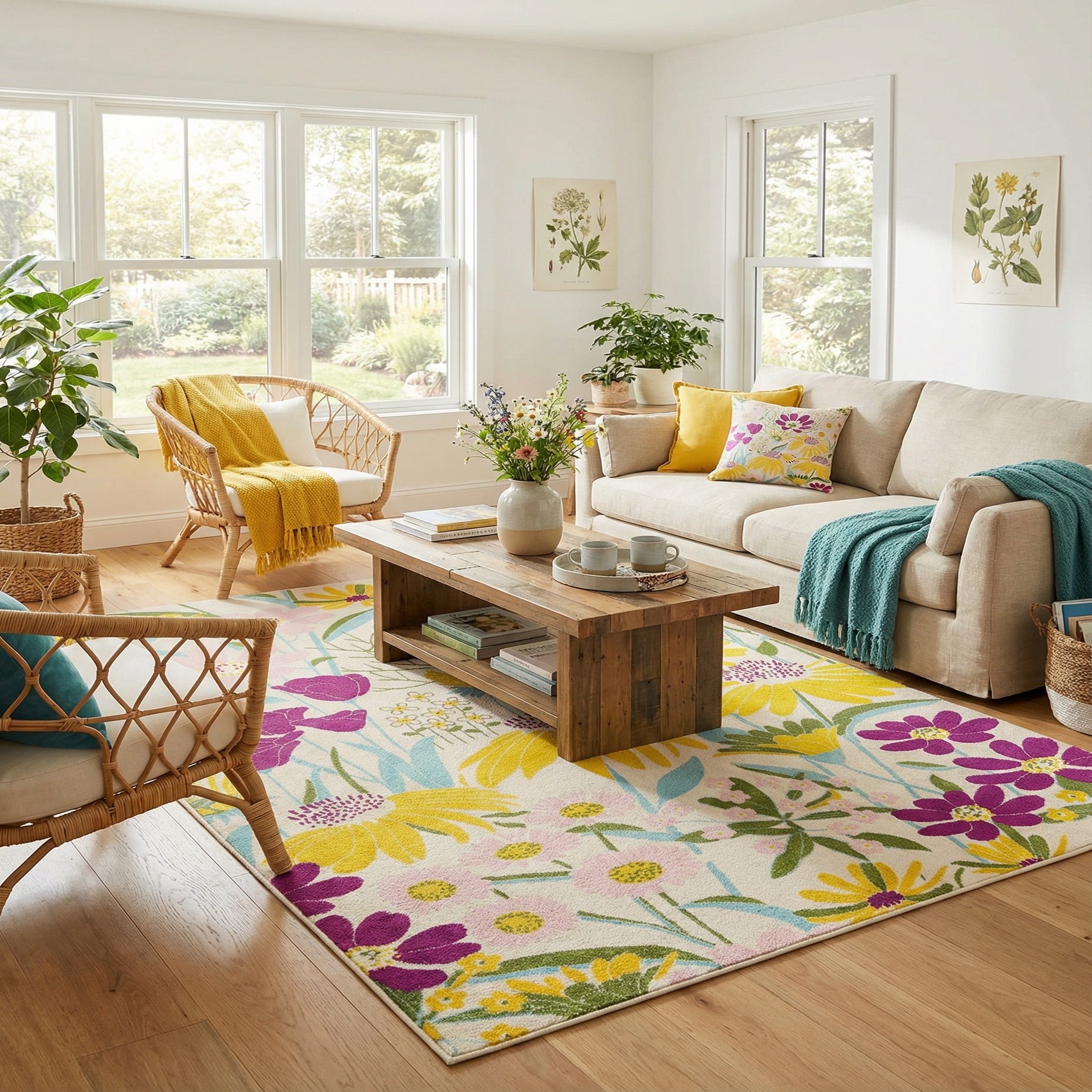 A vibrant 10x13 rectangular area rug featuring a dense floral pattern with large yellow, pink, and purple flowers on a white background, suitable for a living room.