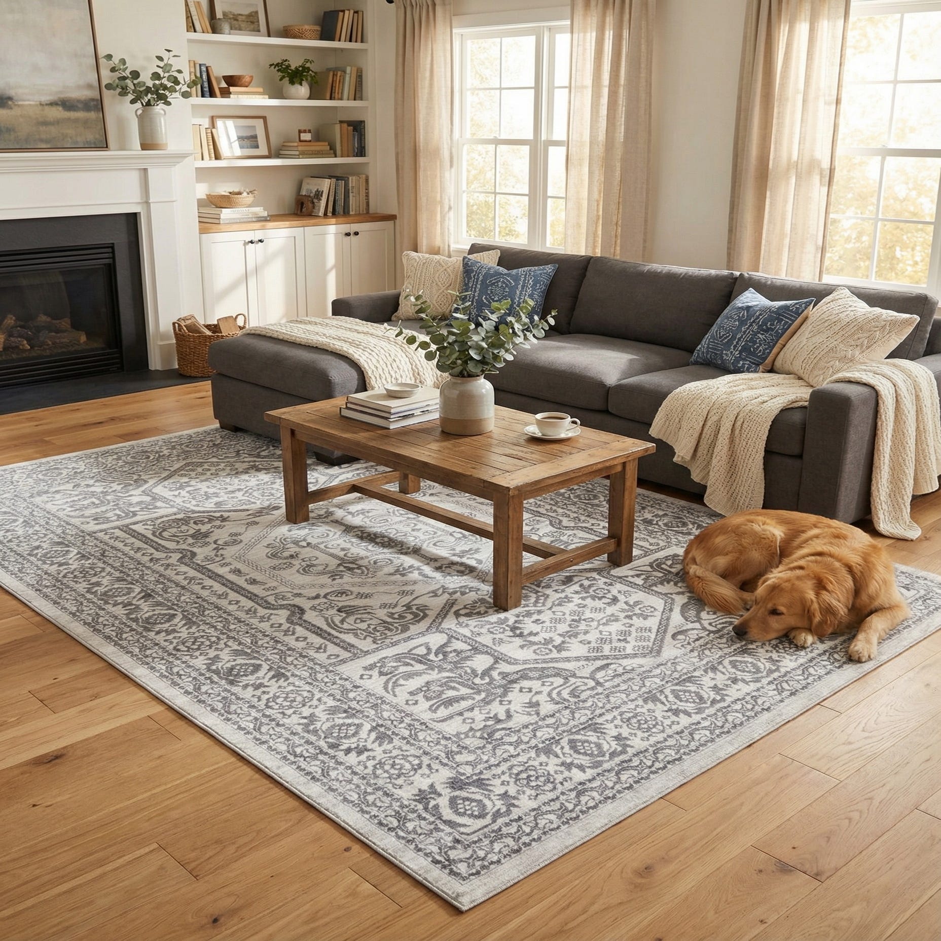 This rug fits well in a range of interior styles — place it beneath a neutral sofa grouping to define a living room, under a bed to add a calm layer of pattern to a bedroom, or beneath a dining set to introduce classic detail without heavy color. It pairs easily with light woods and cool metal accents for a Scandinavian or coastal look, and also complements painted millwork and transitional furnishings when you want a restrained, elegant foundation.