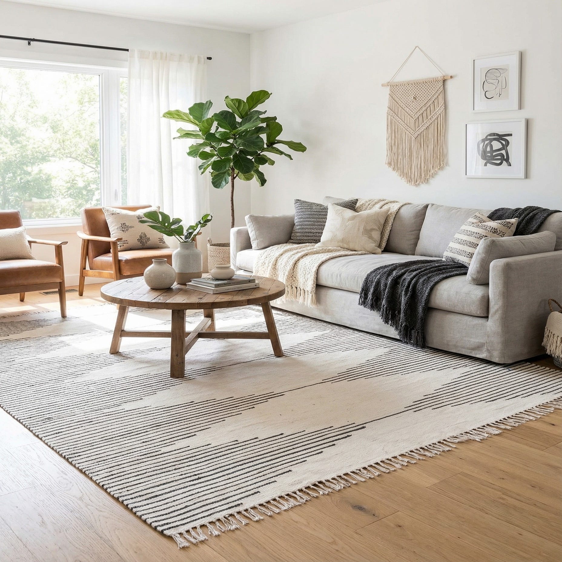 The rug’s monochrome palette and clean pattern suit modern, Scandinavian, coastal, or pared-back bohemian interiors. It anchors a low-profile sofa grouping, compliments a natural-wood dining table, or defines a bedroom seating area without overpowering other elements. Because it’s lightweight and flat, it layers nicely over hard floors or larger neutral rugs and pairs well with matte metals, natural linens, and warm wood tones.