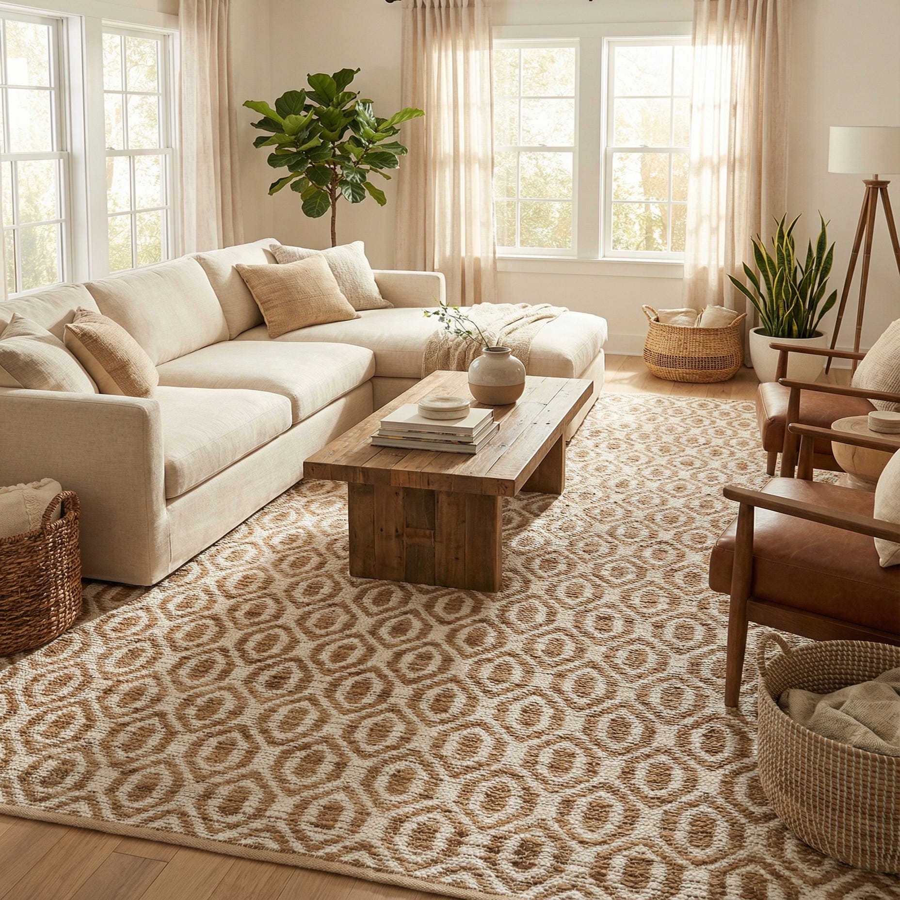 The neutral white and natural palette and the graphic yet understated pattern make this rug well suited to coastal, modern farmhouse, Scandinavian, or contemporary transitional interiors. It works as a grounding layer beneath a sofa and coffee table, as an anchoring piece in a dining area, or as a textural layer at the foot of a bed. Pair with light wood furniture, linen upholstery, and woven accessories for a relaxed, natural look.