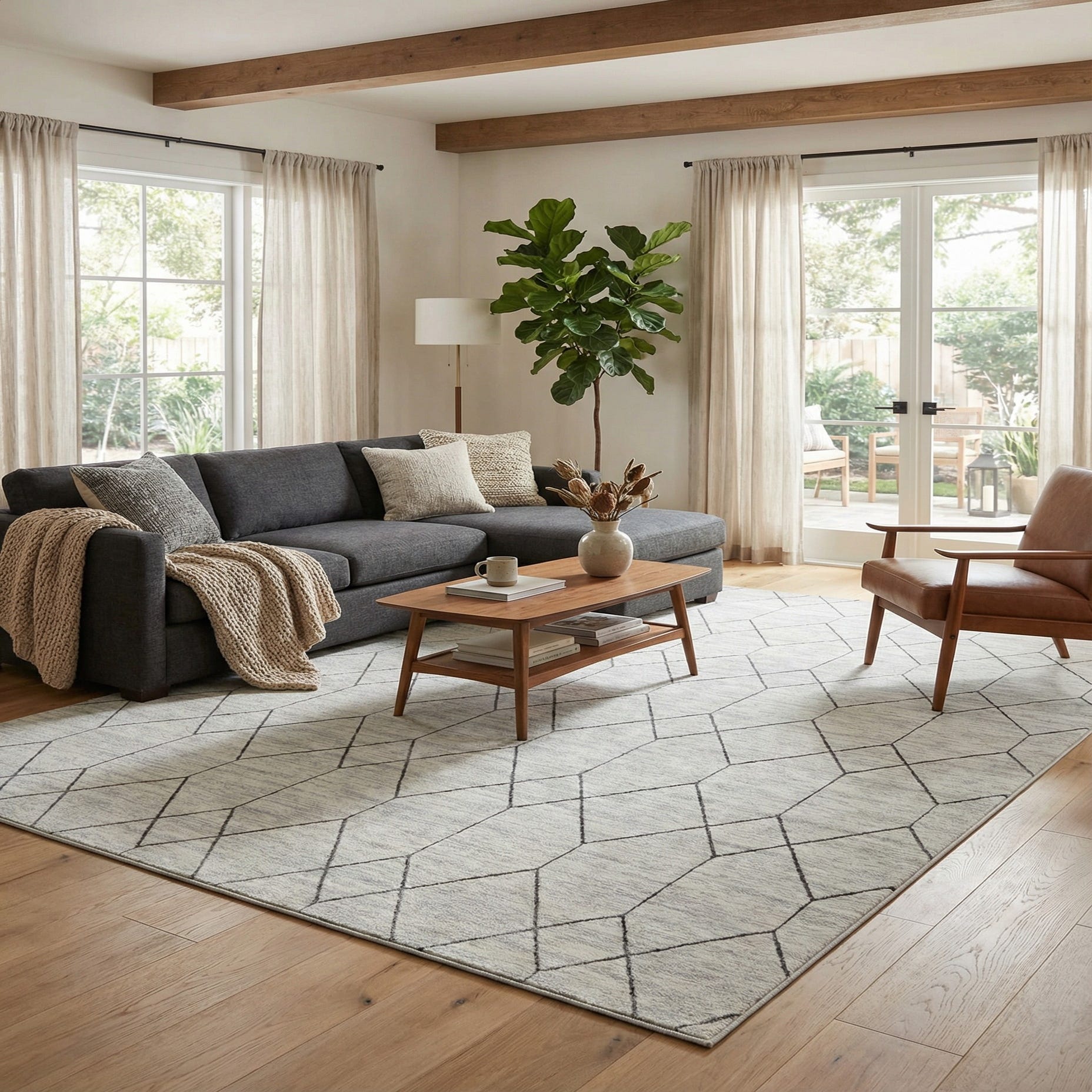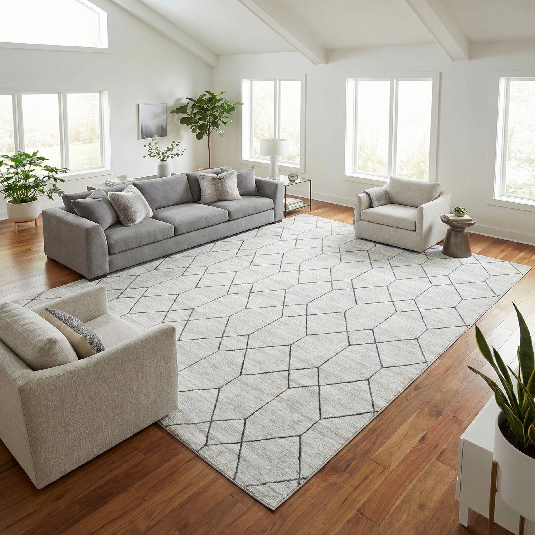 Place it beneath a modern sectional to anchor a living room or under a dining table in an open-plan space to maintain an airy, cohesive feel. It pairs naturally with Scandinavian and minimalist interiors—light woods, neutral linens, and matte metal accents—as well as transitional schemes where a restrained geometric pattern complements both classic and contemporary furnishings. The neutral white-and-gray palette makes it easy to layer with textured throws, woven baskets, or bold accent pieces.