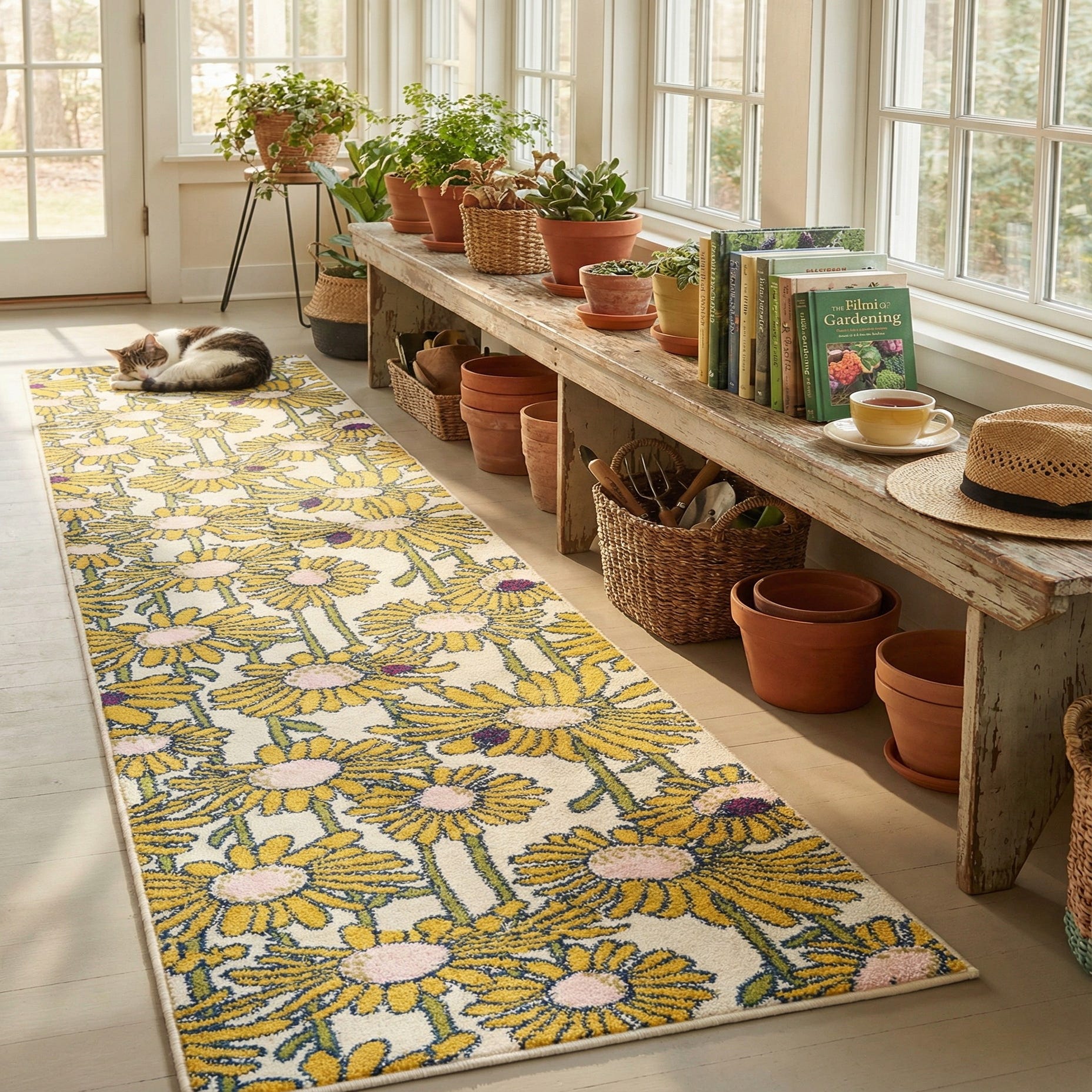 Machine-made from 100% polypropylene, the rug has a low-profile, tightly constructed surface that feels smooth underfoot with subtle raised texture where the floral outlines occur. The clear, defined colorwork pairs especially well with natural wood flooring, white or navy cabinetry, and pastel textiles. Use it as a runner in an entryway or hallway to enliven circulation spaces, layer it in a casual kitchen or mudroom for a cheerful touch, or place it in a bedroom or playroom to introduce color and pattern in a relaxed, modern-cottage setting.