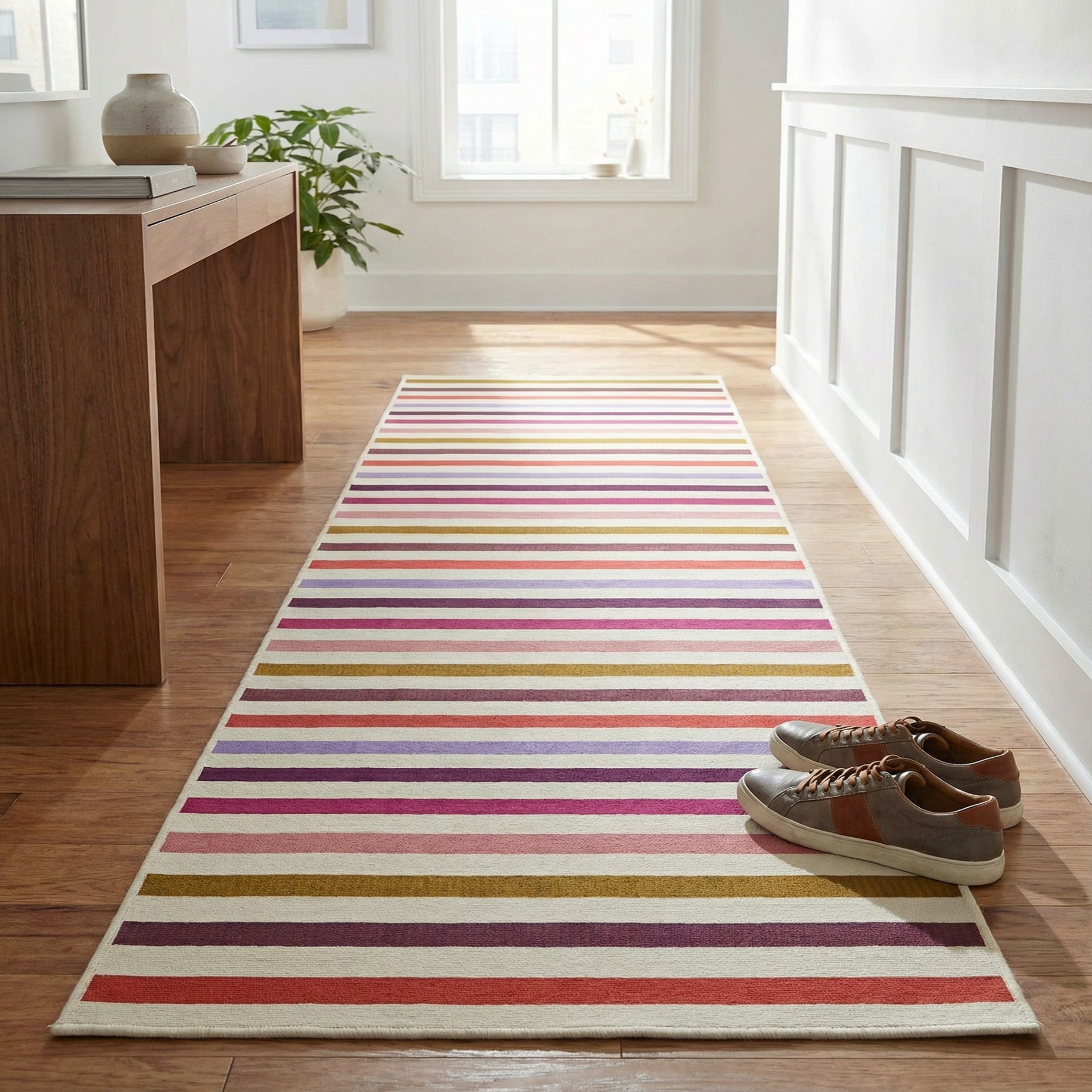 A 12 ft runner rug with a modern stripe pattern featuring alternating white, purple, red, and brown horizontal bands.