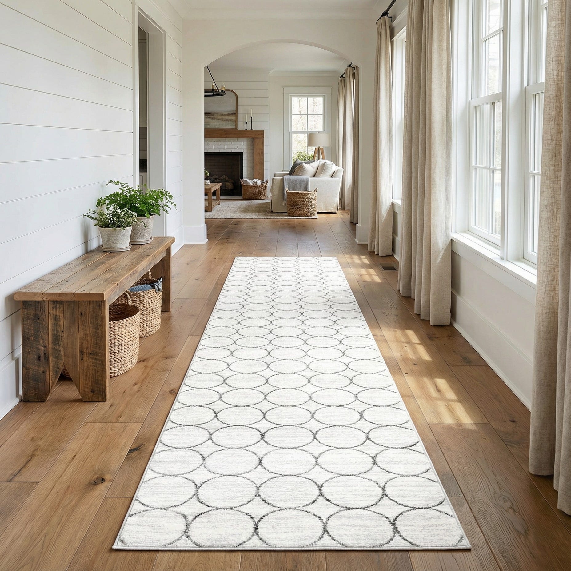 This runner works well in hallways, entryways, kitchen aisles or alongside a sofa to add linear interest without overwhelming a room. Its neutral white-and-gray palette pairs easily with light wood tones, painted cabinetry, or contemporary metal accents, and it complements modern, Scandinavian, or transitional interiors where a restrained graphic element is desired.