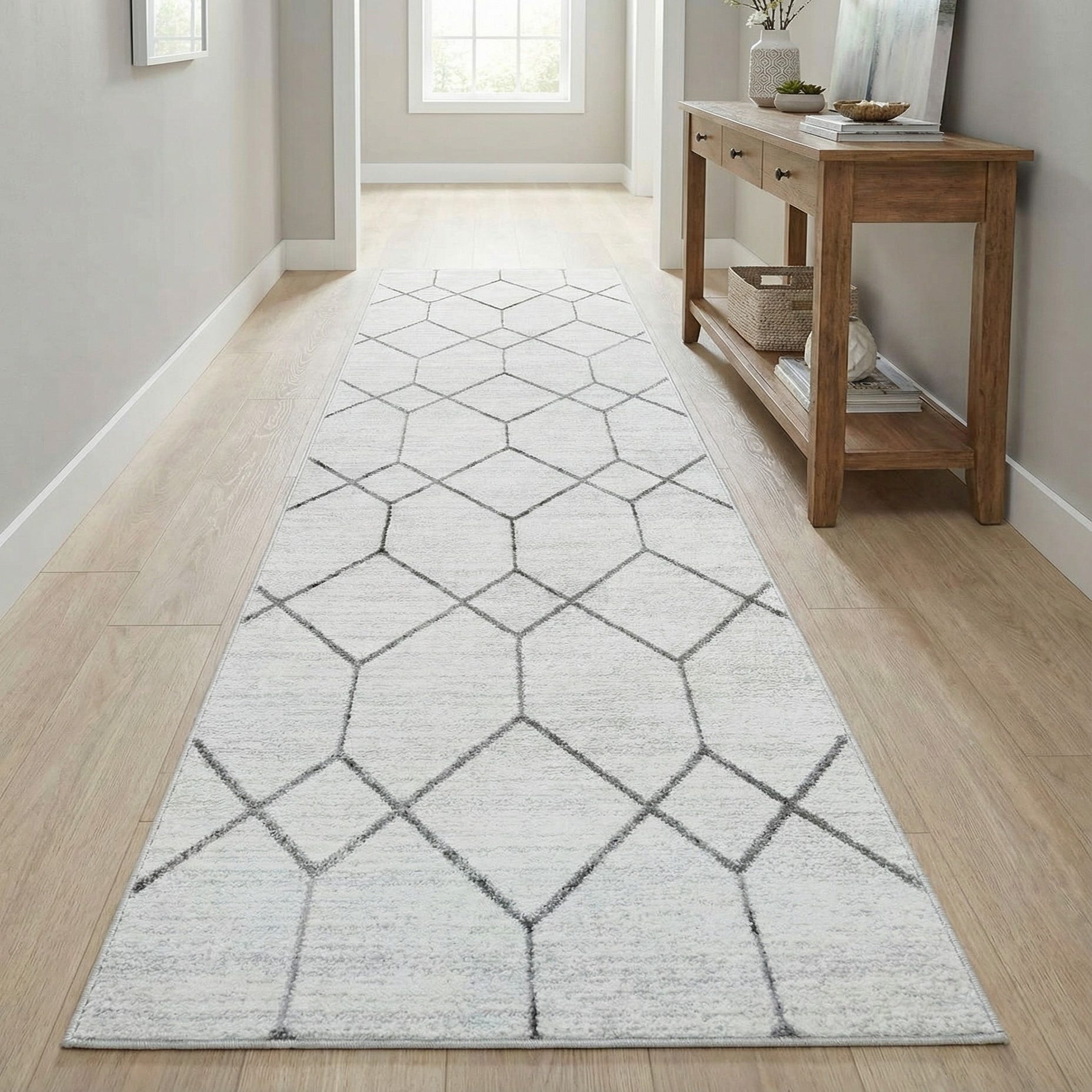 A 13 ft runner rug featuring a white background with a repeating gray trellis pattern, ideal for a hallway.