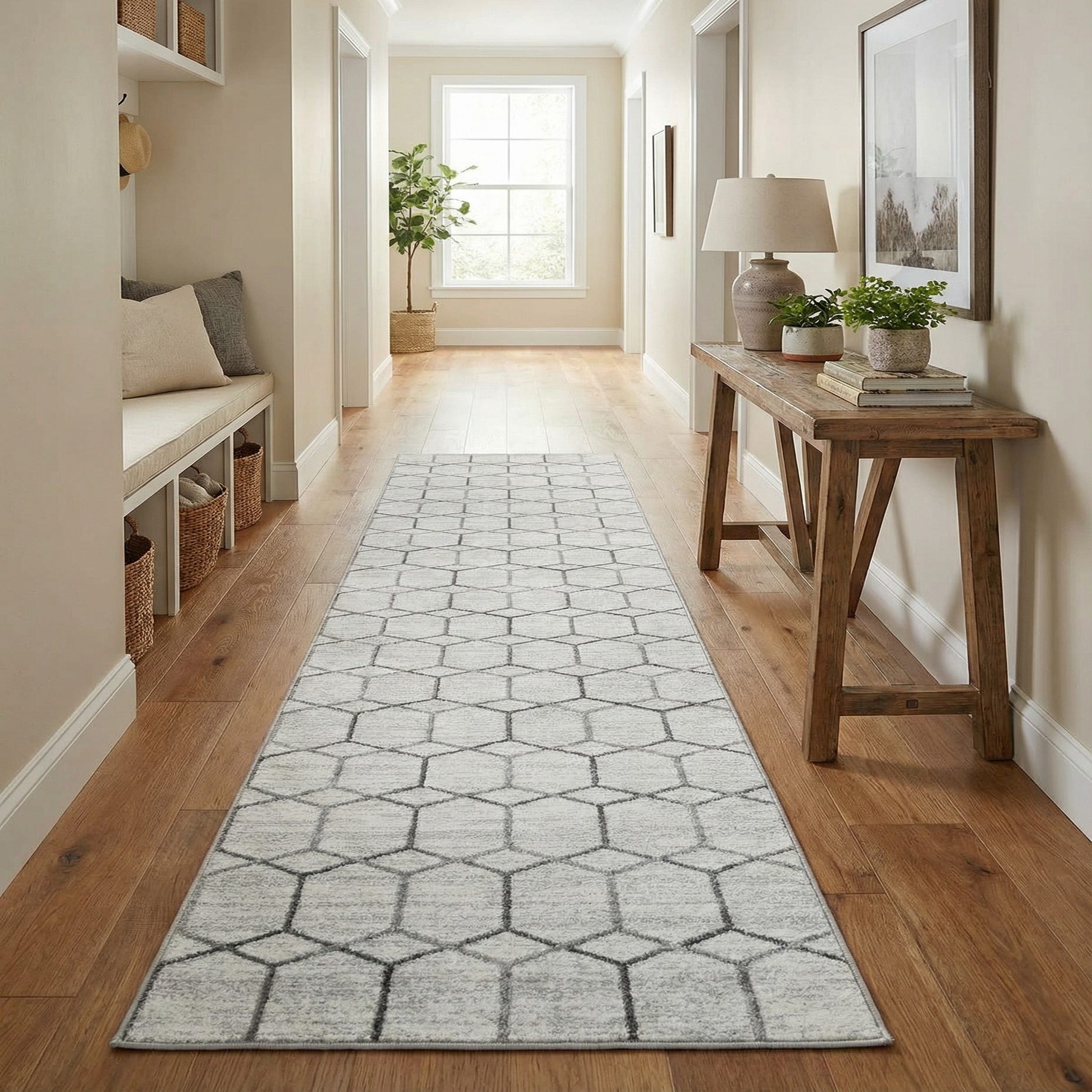 This runner works well in long, narrow spaces such as hallways, entryways, or beside a kitchen island, and pairs naturally with light wood floors or cool-toned tile. It complements minimalist, Scandinavian, and transitional interiors—think pared-back furnishings, metal or matte black accents, and layered neutrals like charcoal, soft gray, or pale blue. Use it to anchor a simple gallery wall or to add subtle geometric interest to a clean-lined bedroom or apartment corridor.