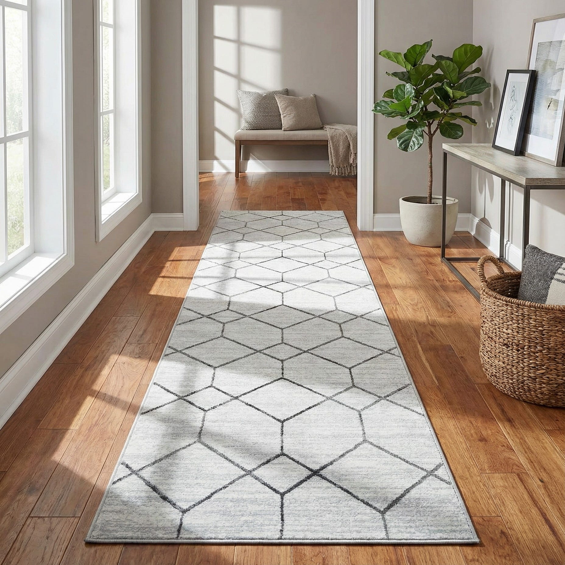 Ideal for hallways, entryways, or narrow kitchen walkways, this runner brings a calm, linear rhythm to long, transitional spaces. The neutral white-and-gray palette pairs exceptionally well with light wood floors, cool-metal accents, and minimalist or Scandinavian furnishings, and it also complements farmhouse or modern-traditional schemes by adding a clean geometric anchor. Place it beneath a console table or alongside a bed to guide the eye through the room and soften high-traffic corridors with understated texture.