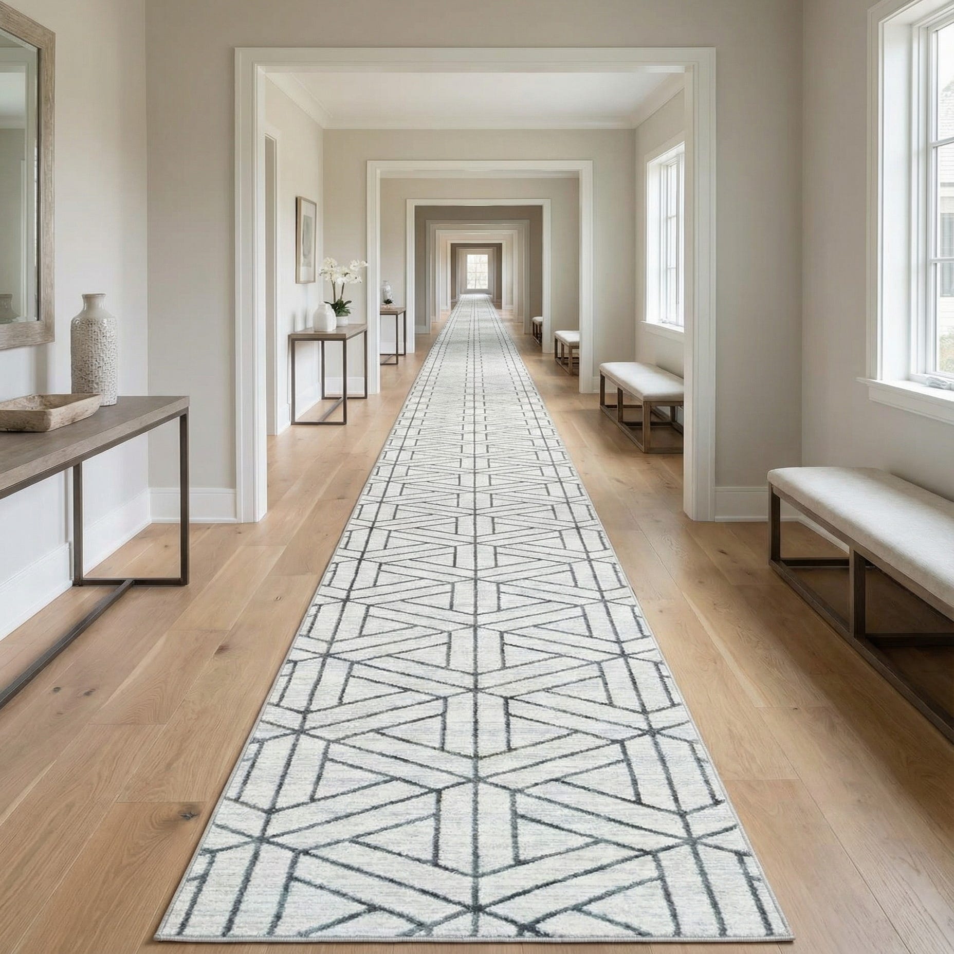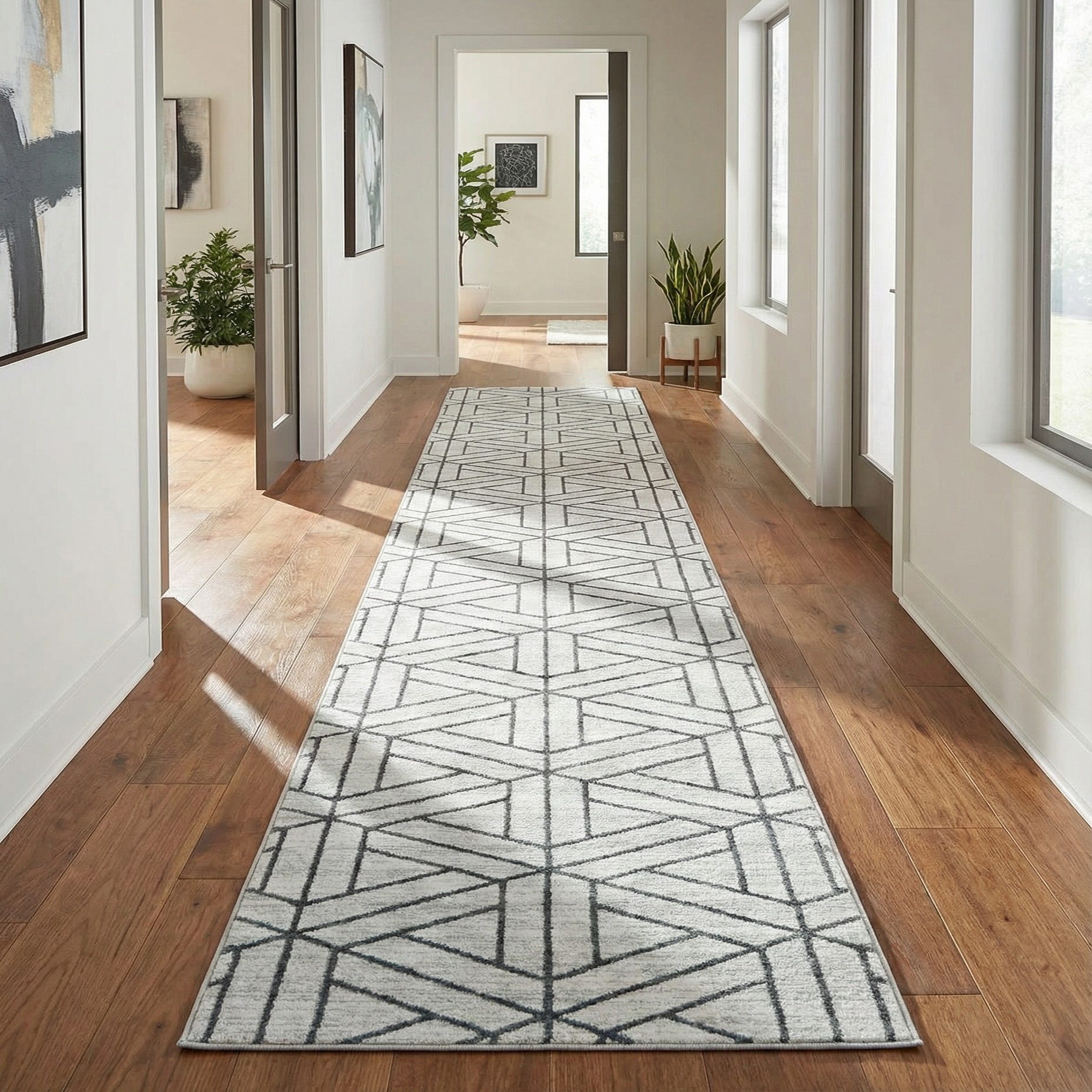 A long 20 ft runner rug featuring a modern white and black trellis pattern, ideal for hallways.