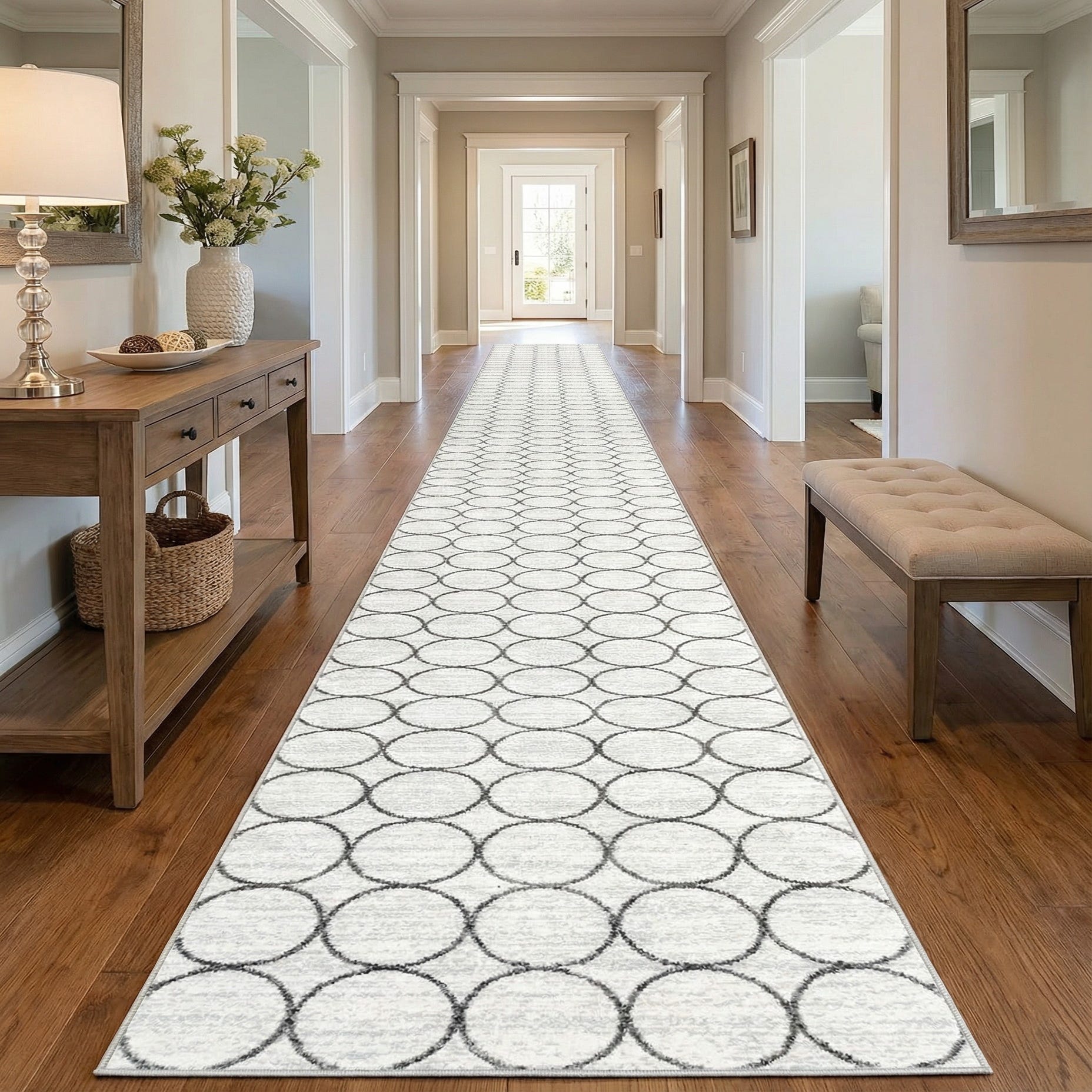 Machine-made from 100% polyester, this runner works well in narrow, functional spaces where style matters—hallways, entryways, and galley kitchens. It pairs naturally with light wood floors and minimalist furnishings, and also complements monochrome, Scandinavian, or contemporary interiors that favor clean lines and understated pattern. Use it to define a passage, anchor a seating vignette in an open-plan space, or soften modern metal and glass accents.