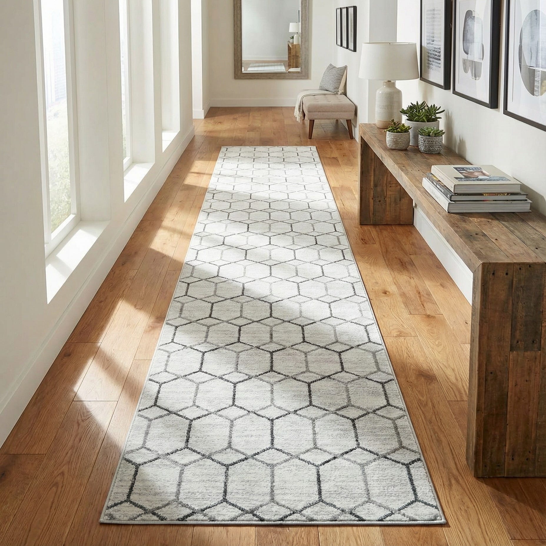 A long, white 20 ft runner rug with a modern trellis pattern in shades of gray and black, ideal for a hallway.