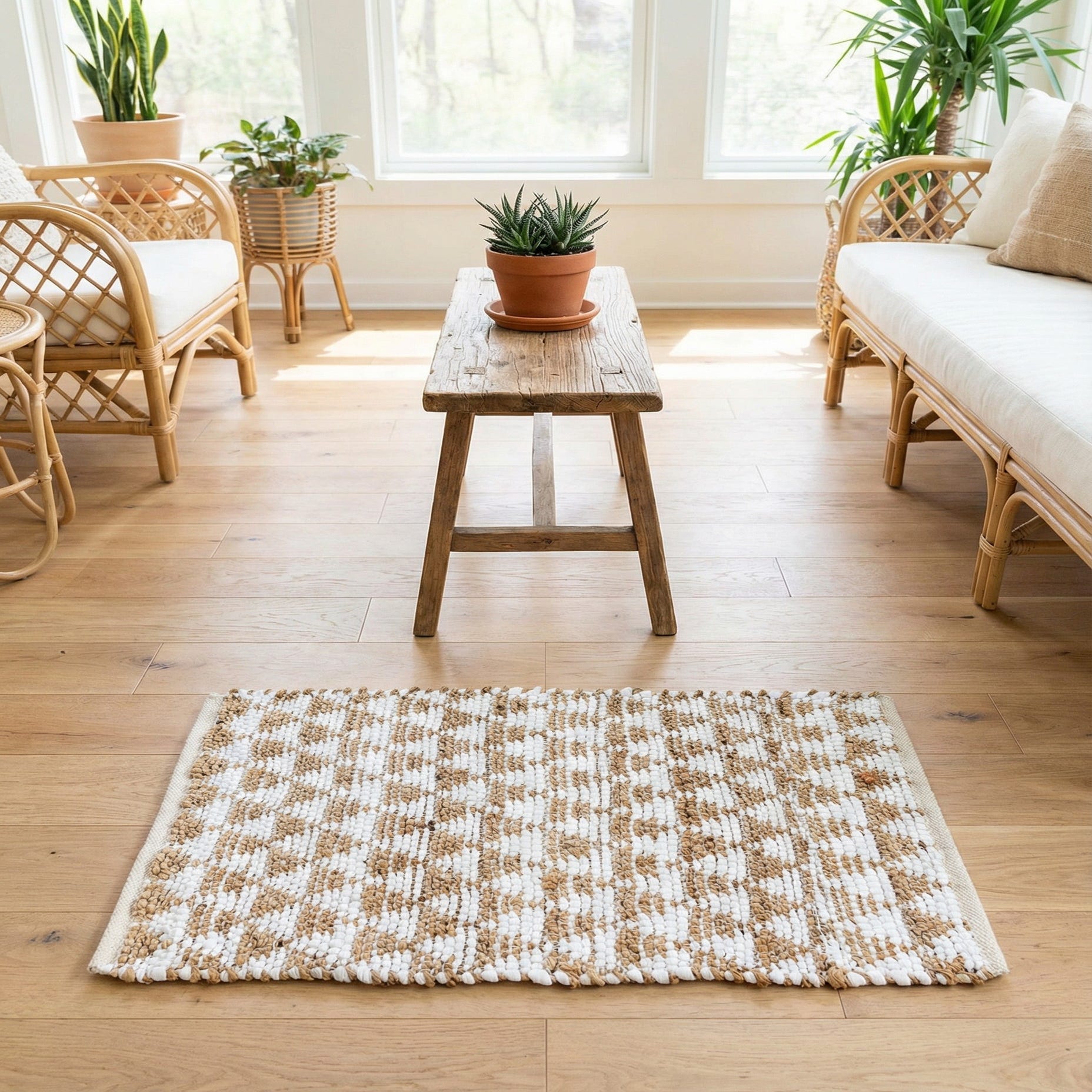 Hand-woven from 60% cotton and 40% jute, this flatwoven piece pairs a clean white ground with warm natural jute woven into a repeating, small-scale geometric motif. Running rows of braided jute alternate with chunky cotton slubs, creating a tangible contrast between smooth, soft fibers and firmer, earthier texture. The low-profile weave lies flat underfoot while the mixed fibers add subtle dimensionality and organic color variation.