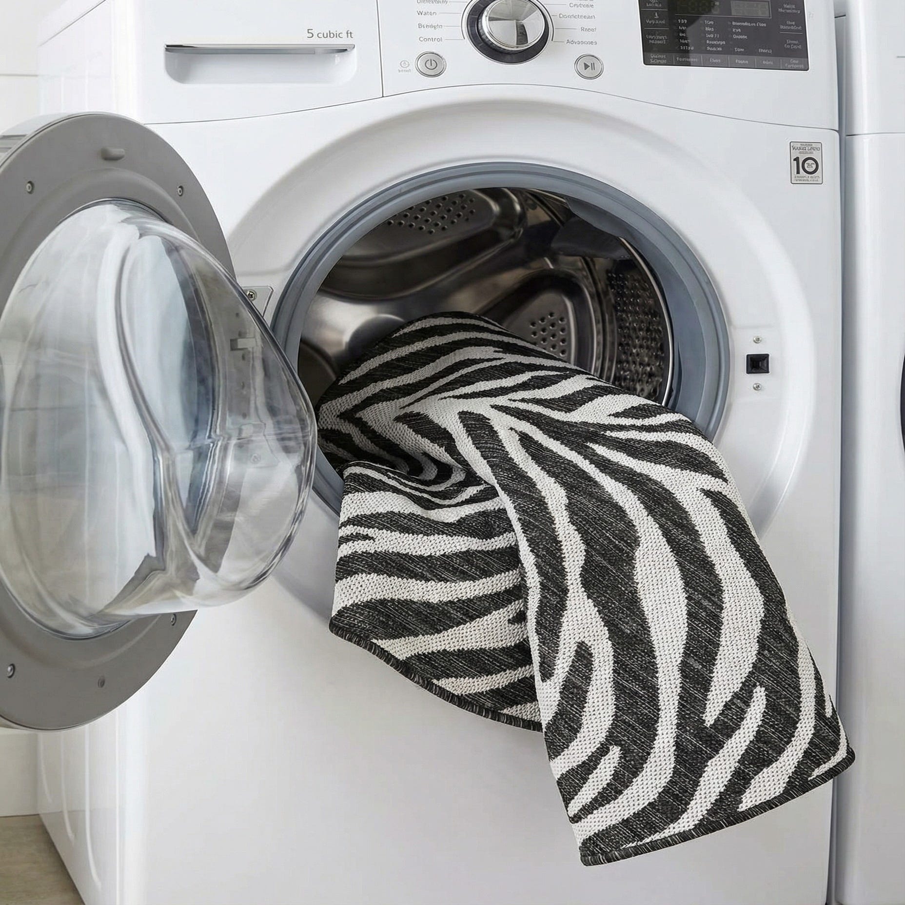 A high-contrast zebra motif in charcoal tones sits on a crisp white ground, giving this round rug a strong graphic presence. The pattern’s flowing stripes create visual movement across a low-profile, flatwoven surface. Machine-made from 100% polypropylene, the construction produces a slightly textured, resilient hand that layers well over hard flooring and holds its shape under furniture.