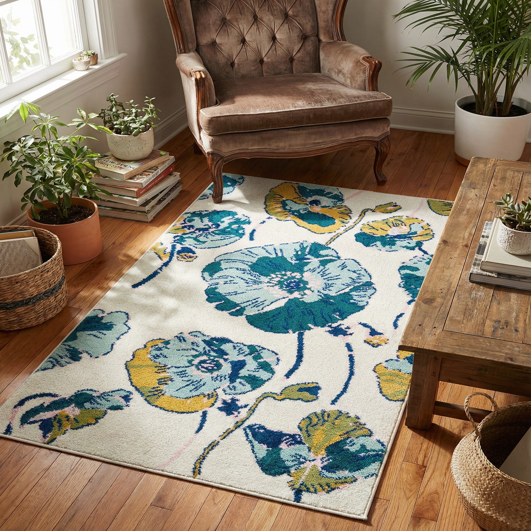 Machine-made from 100% polypropylene, the rug offers a low-profile, slightly cushioned pile that feels soft underfoot while the floral motifs have a gently raised, sculpted texture against the smoother background. Place it in a small living room, entryway, sunroom or bedroom to introduce color without overwhelming the space; it pairs particularly well with light wood tones, rattan accents, navy upholstery or soft pastel linens for a bright, relaxed interior.