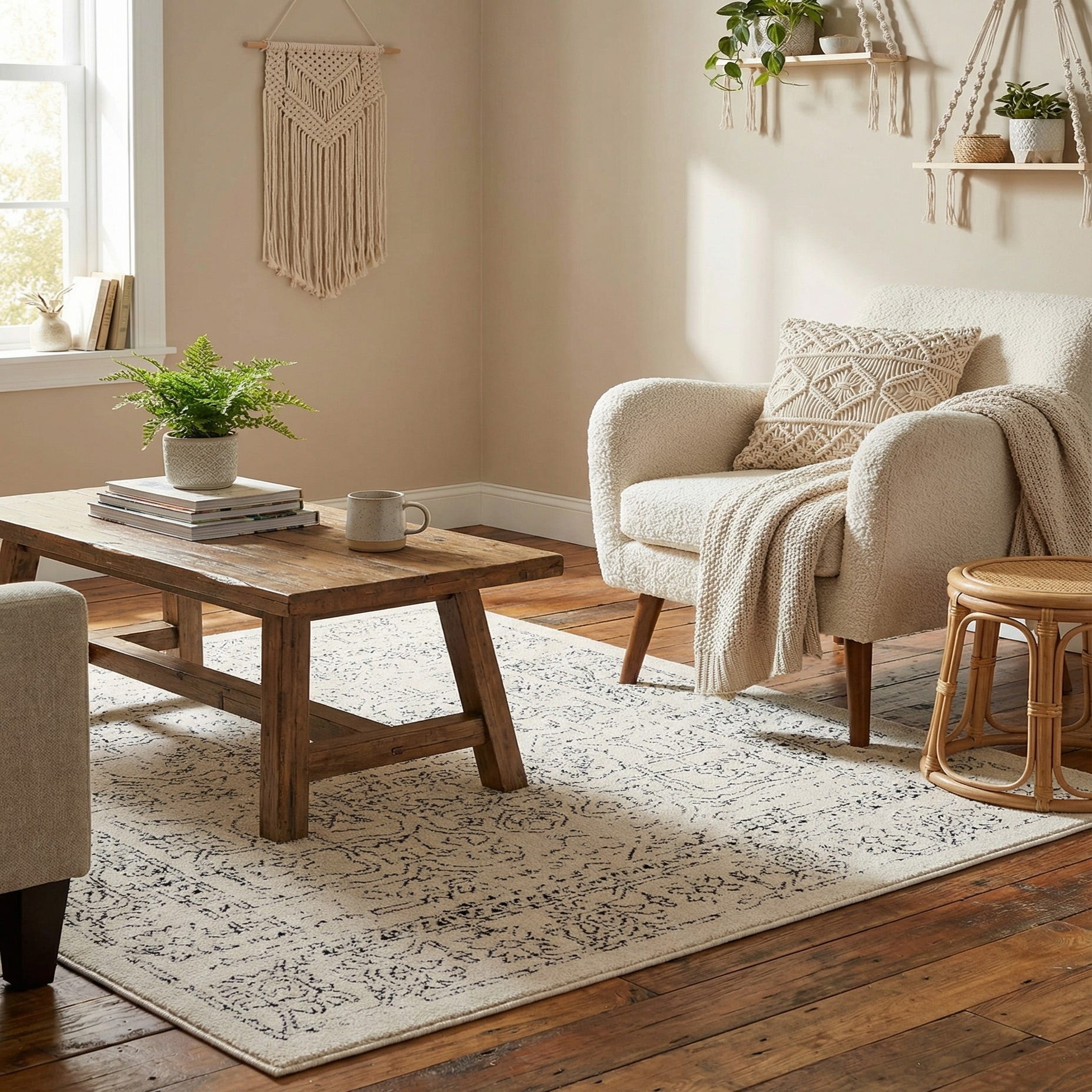 This neutral palette and vintage-inspired pattern work well wherever you want quiet structure without heavy color. Place it beneath a coffee table to anchor a modern living room, layer it under a platform bed to add softness to a bright bedroom, or use it in a home office or entry to introduce pattern while keeping the space airy. It pairs nicely with light woods, black metal accents, linen fabrics, and a restrained color scheme for Scandinavian, contemporary, or transitional interiors.