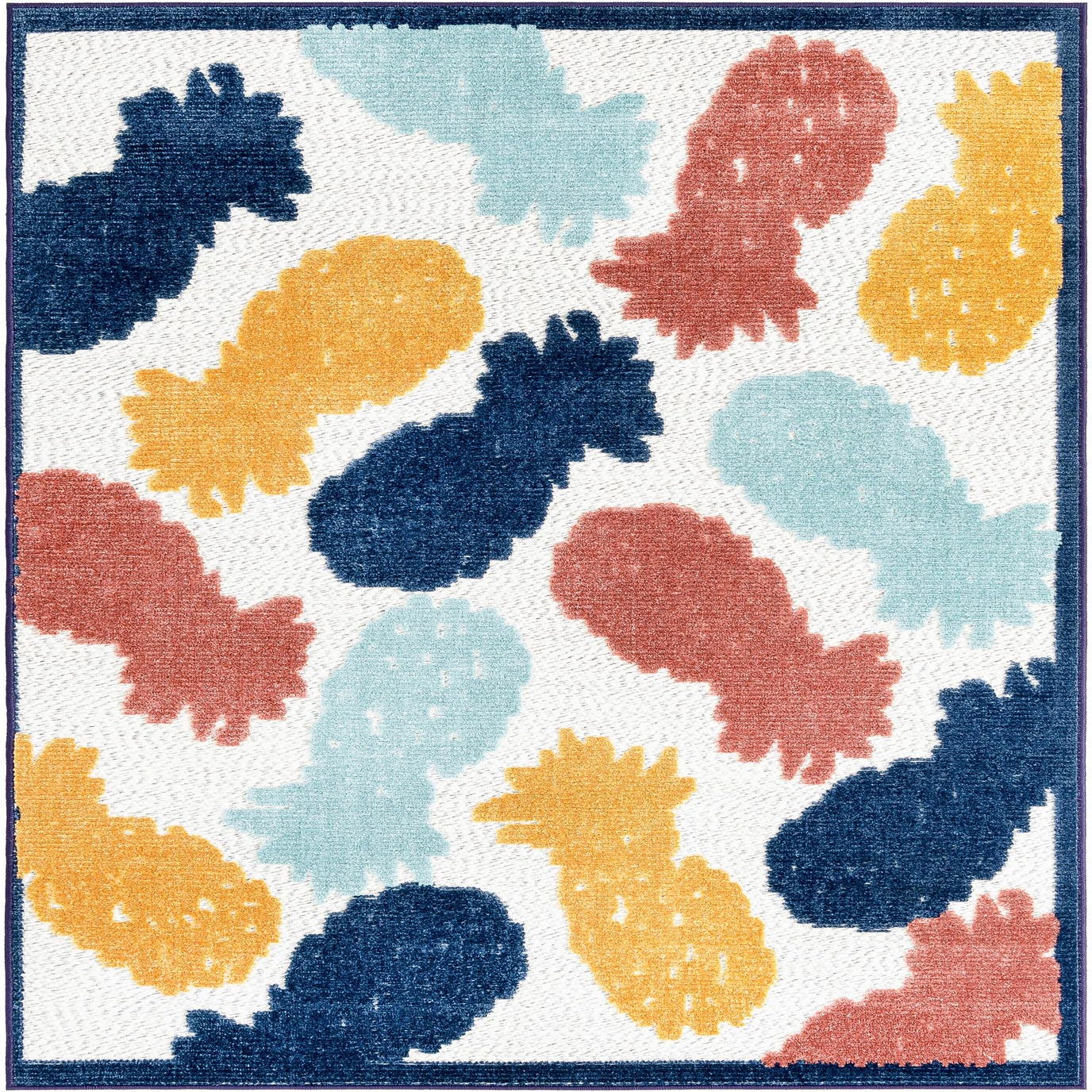 A 4x6 rectangular indoor/outdoor rug featuring a playful abstract pineapple pattern in navy, light blue, orange, and coral on a white background, with a navy border.
