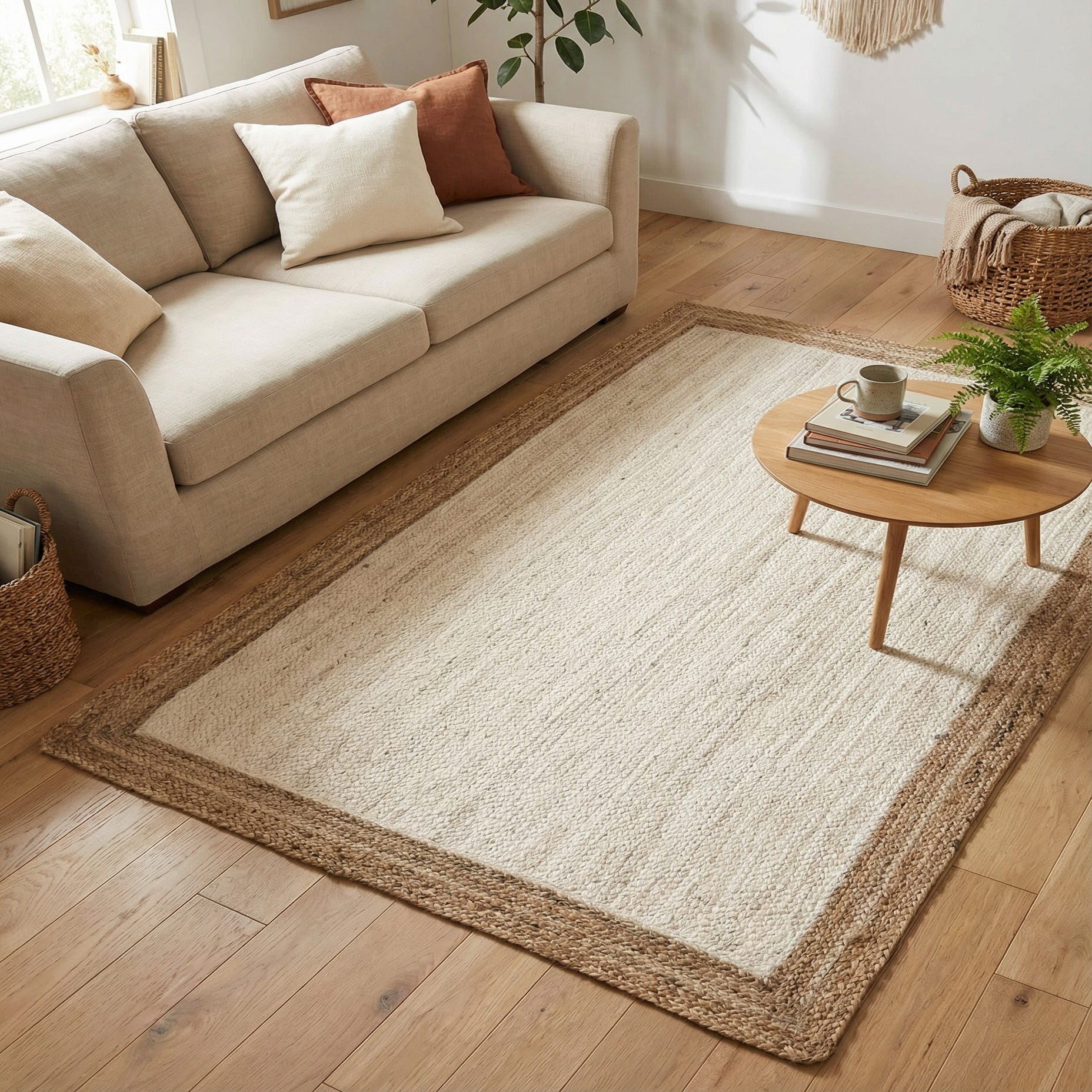 Hand-braided from 100% jute, this rug pairs a clean white field with a natural beige braided border for a calm, grounded look. The surface features tight, parallel braids that create a low-profile, subtly ribbed texture, while the thicker braided rounds at the edge add visual definition and a modest, raised frame. The fibers have an organic, tactile feel—firm underfoot with natural variation in tone and weave that adds depth without fuss.