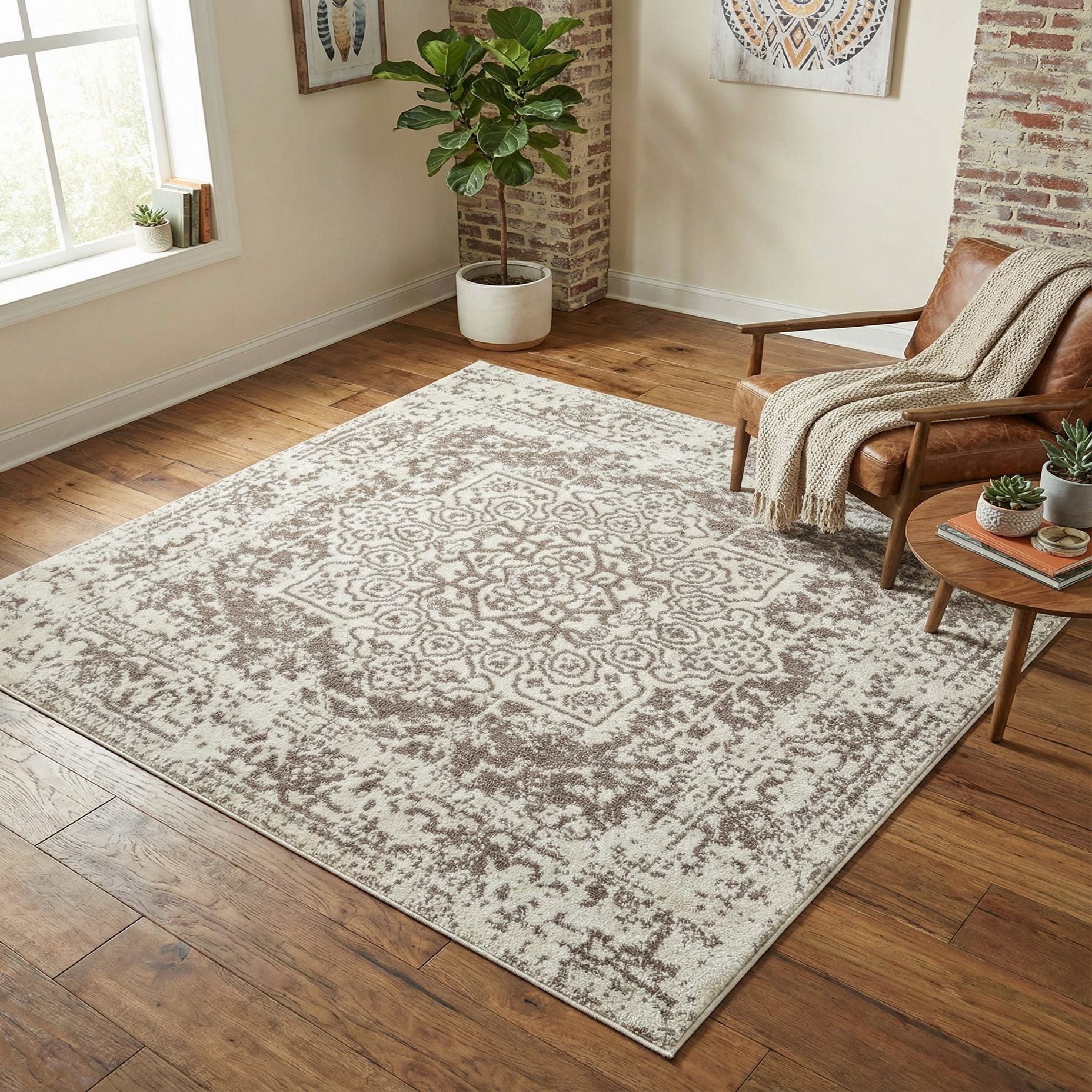 This rug works well in transitional, modern farmhouse, Scandinavian, or coastal interiors where a neutral anchor is needed. Use it to define a small seating area or entry, layer it under a coffee table, or place it at the foot of a bed to soften the space. It pairs nicely with warm wood furniture, matte metal accents, and soft gray or white textiles for a calm, cohesive look.