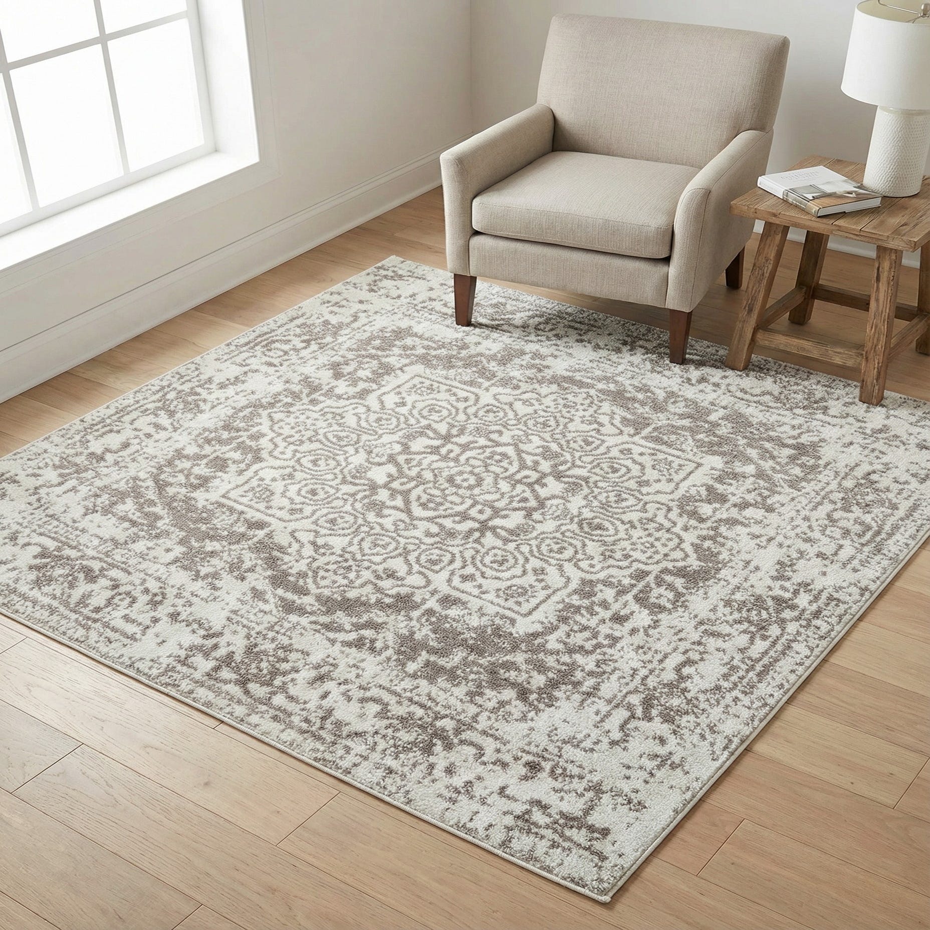 A softly distressed medallion pattern rests on a white ground, with the central medallion and surrounding arabesque motifs defined in cool gray. The design carries a vintage-inspired, worn-in effect with subtle fading around the border that gives the rug a relaxed, lived-in character without overwhelming a room. Machine-made of 100% polypropylene, the rug has a low, dense pile that feels smooth and slightly cushioned underfoot and shows the pattern with clear definition and a gentle, understated sheen.
