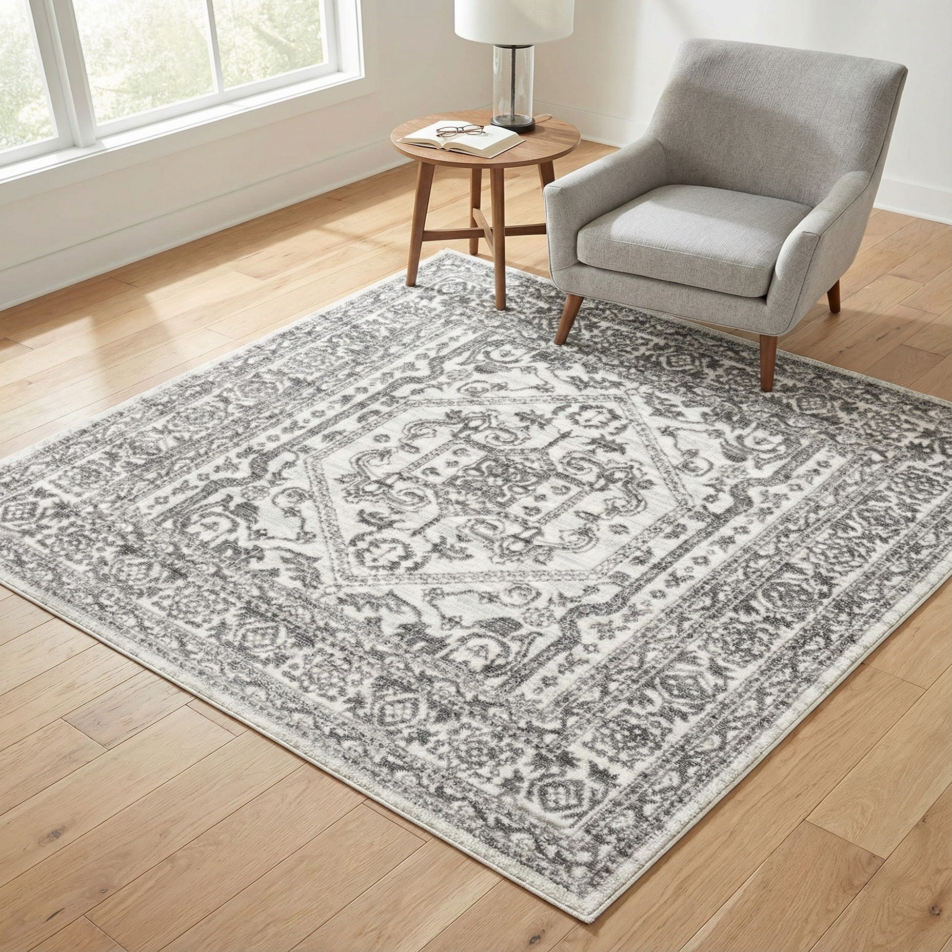 A refined, traditional medallion layout sits on a crisp white background, with delicate gray scrollwork and floral motifs forming an octagonal center and layered border. The pattern blends classic Persian-inspired detailing with a slightly faded effect that softens the contrast between the tones. Machine-made from 55% polypropylene and 45% polyester, the rug has a low pile with a smooth, soft hand that lays flat and feels comfortable underfoot.