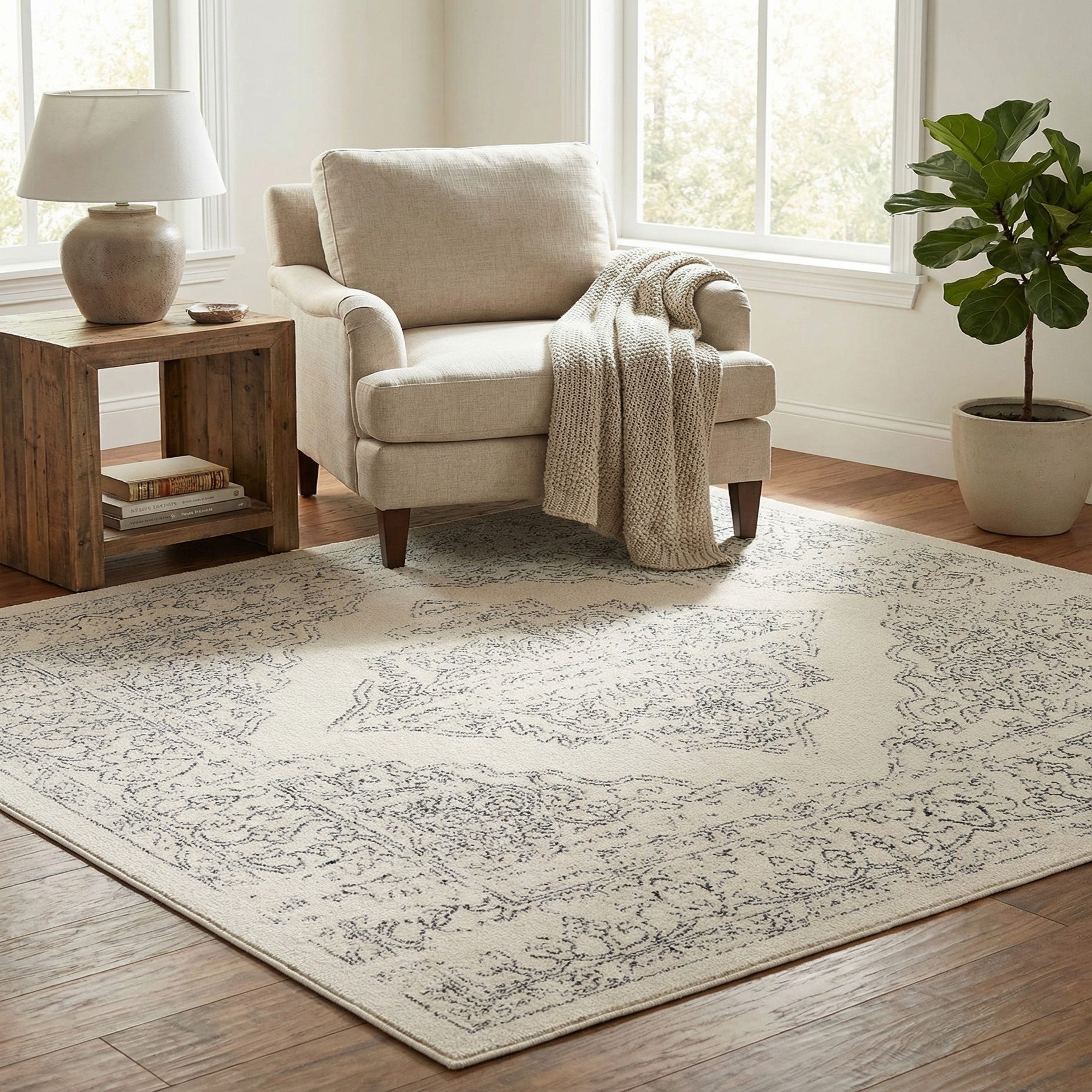 A 5'x5' square white rug with a distressed black traditional medallion pattern, ideal for a living room or bedroom.