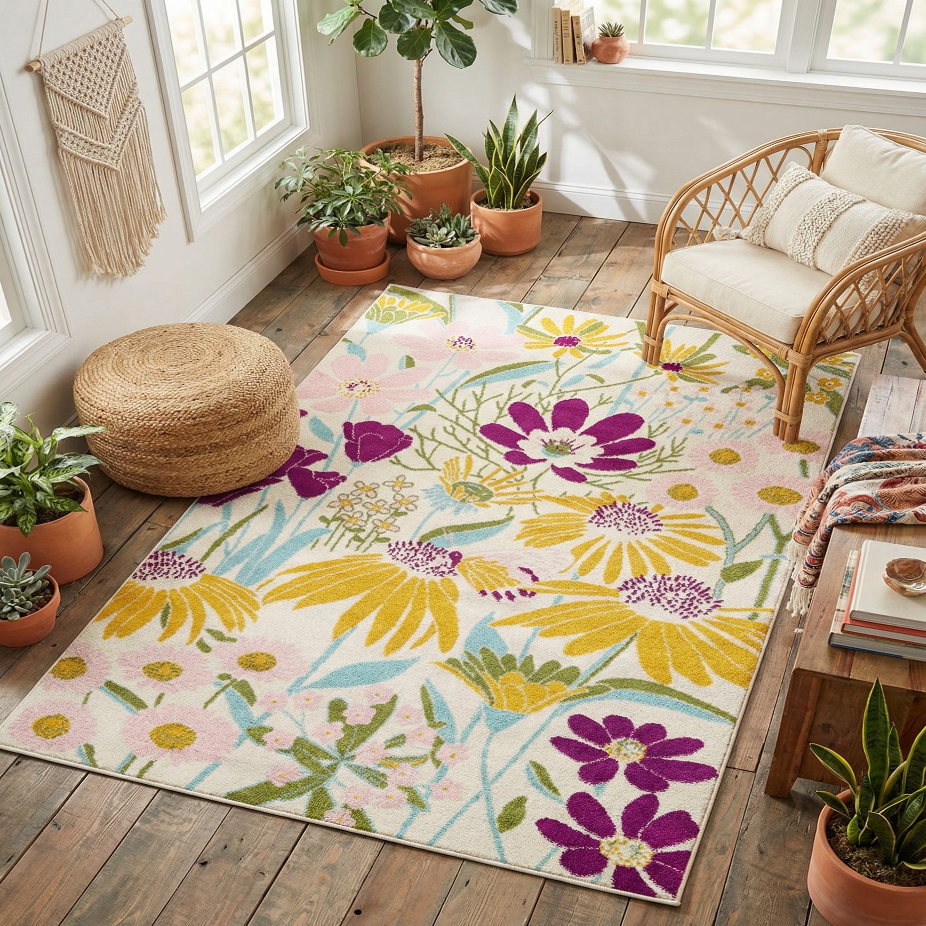 Crafted from 100% polypropylene, this machine-woven rug ensures durability and ease of maintenance. Its stain-resistant properties and shed-free nature make it an ideal choice for high-traffic areas or homes with pets and children. Thanks to its bright and versatile palette, this rug harmonizes with a range of decor styles, including contemporary, cottage, and transitional interiors. It can provide a colorful statement in a neutral space or complement an already vibrant room. The soft texture underfoot adds a layer of comfort, making it suitable for living rooms, bedrooms, and playrooms where a cozy atmosphere is desired.