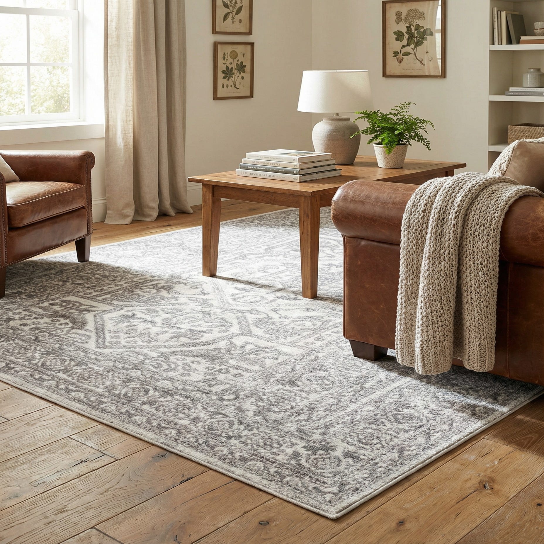 This neutral palette and timeless pattern pair well with a range of interiors: place it under a coffee table in a light, modern living room, anchor a bedroom with linen bedding and pale wood furniture, or add calm contrast to a contemporary entryway. It also complements transitional schemes that mix traditional silhouettes with minimalist accessories, and works nicely alongside charcoal accents, metallic lighting, or soft pastel textiles.
