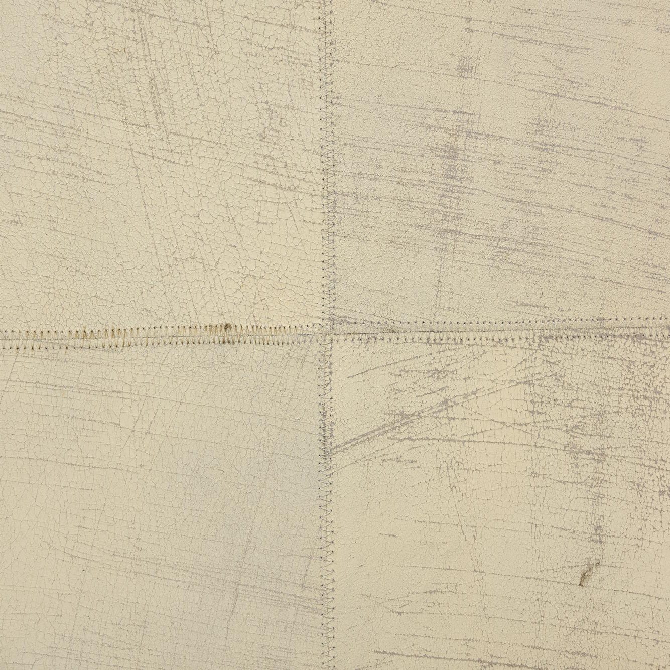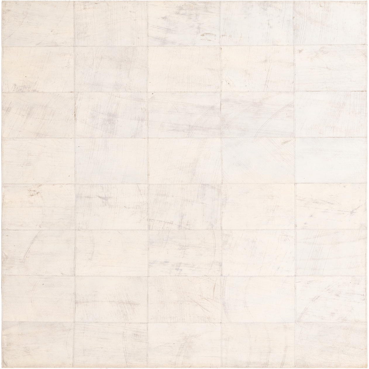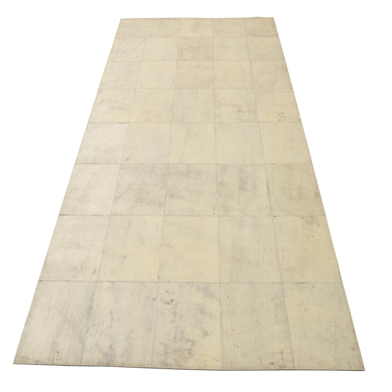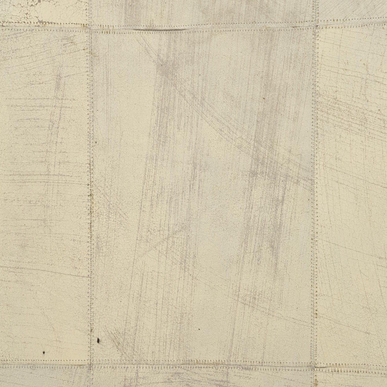 This Cowhide Leather rug features a modern and minimalist patchwork design, skillfully handcrafted from cowhide and leather materials. Its 5x8 dimensions present large, square patches in a symmetrical grid pattern, offering a contemporary aesthetic. The color palette is neutral, with a clean white background accented by subtle variations of silver that add depth and texture to the rug's surface. The sleek finish of the cowhide provides both visual and tactile interest, resulting in a luxurious feel underfoot.