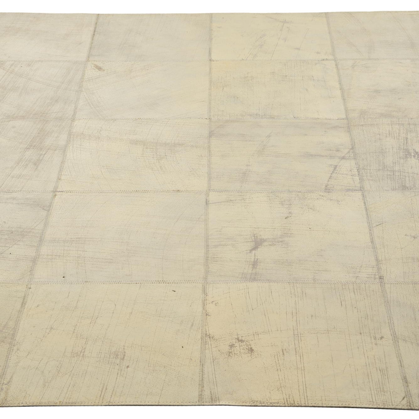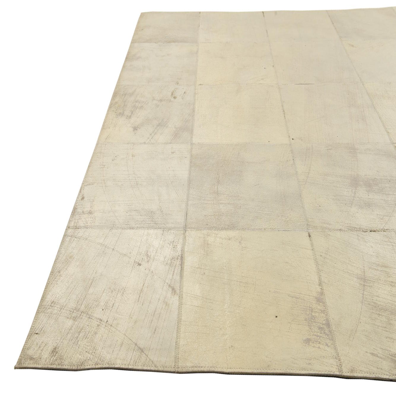 A 5x8 rectangular white cowhide and leather rug with a modern patchwork pattern, ideal for a living room.