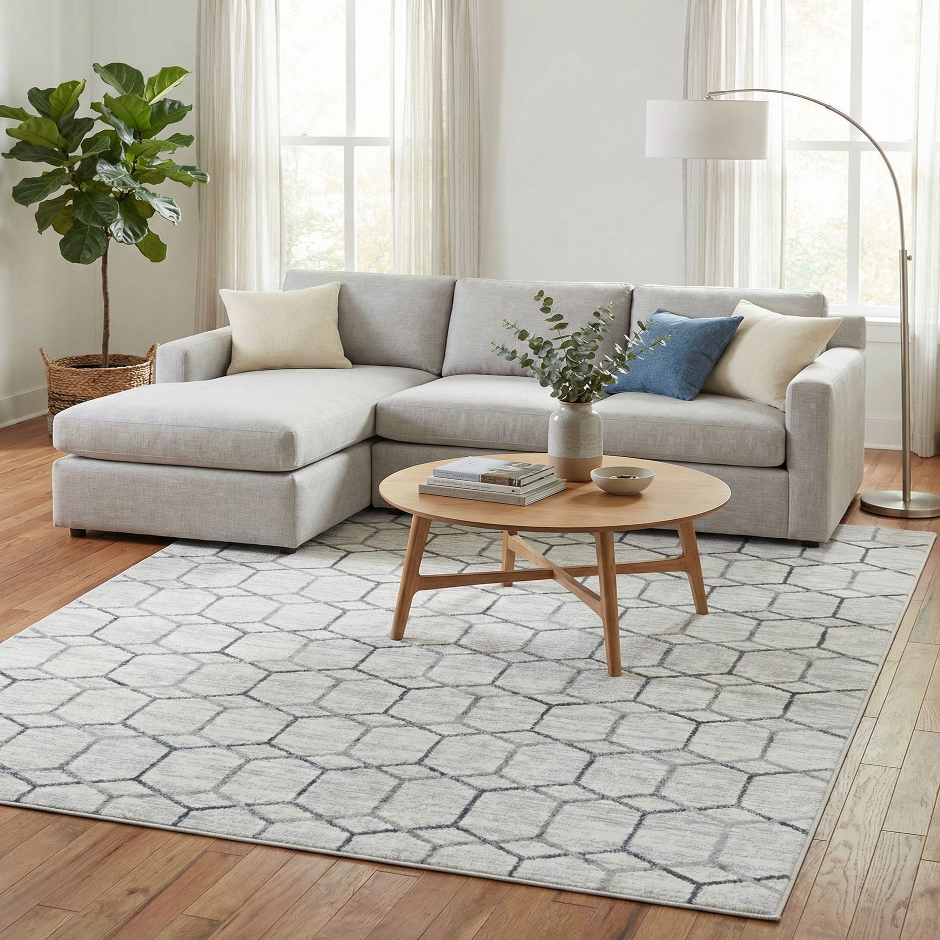 This rug works well in contemporary and transitional interiors—place it under a living room seating area to anchor neutral sofas, layer it in a bedroom to add a calm, structured element, or set it beneath a desk in a home office for a polished look. Pair with light wood tones, charcoal or steel accents, and simple, streamlined furnishings for a cohesive, modern aesthetic.
