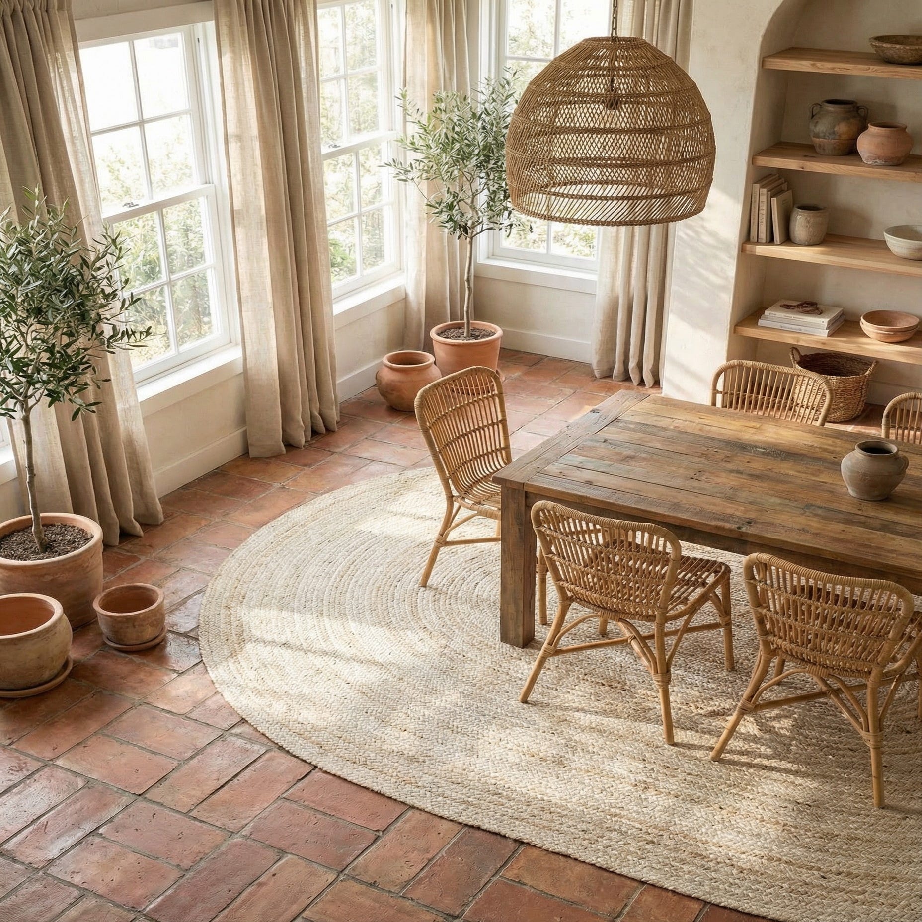 This piece works well in casual, layered interiors where natural materials are central. Pair it with light wood furniture and linen upholstery for a coastal or Scandinavian look, layer it under a round dining table for a relaxed breakfast nook, or place it in a foyer or at the foot of a bed to add textural interest without visual heaviness. It also complements farmhouse and bohemian schemes when mixed with woven baskets, plants, and textured throws.