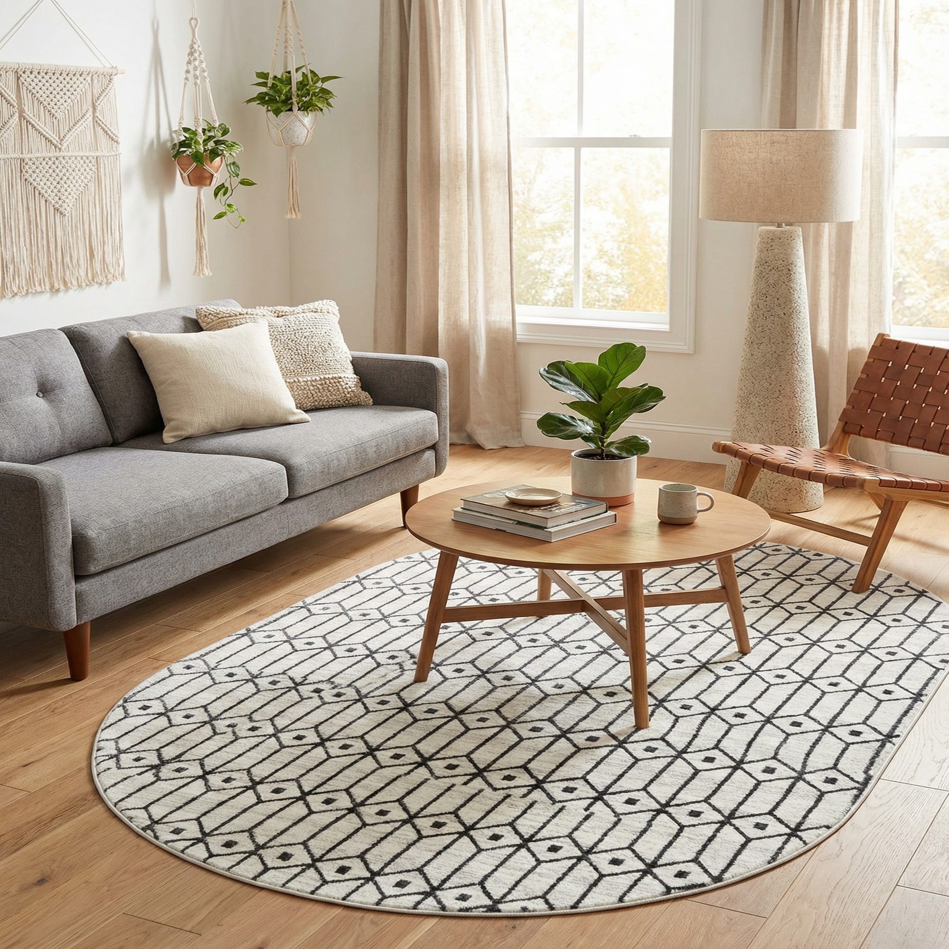This rug pairs well with contemporary, Scandinavian, or transitional interiors — think light wood furniture, matte black metal accents, and simple, streamlined silhouettes. Use it to anchor a round dining table, define a small seating area in an apartment living room, or add a finished touch at the foot of a bed. Neutral textiles and subtle gray accessories will echo the pattern for a cohesive, layered look.