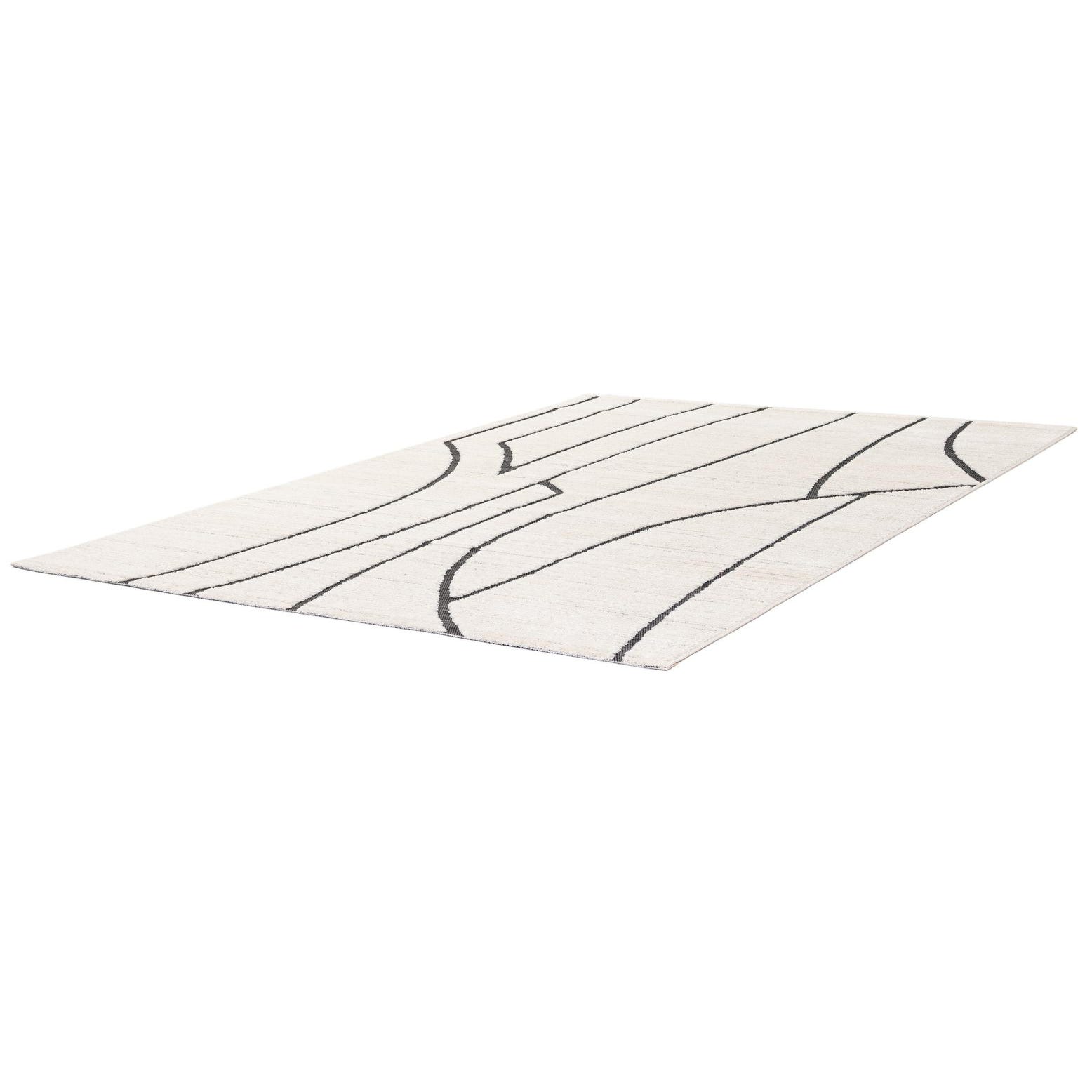 A 5x8 rectangular Tagine rug featuring a modern abstract pattern of thick black lines on a textured white background.