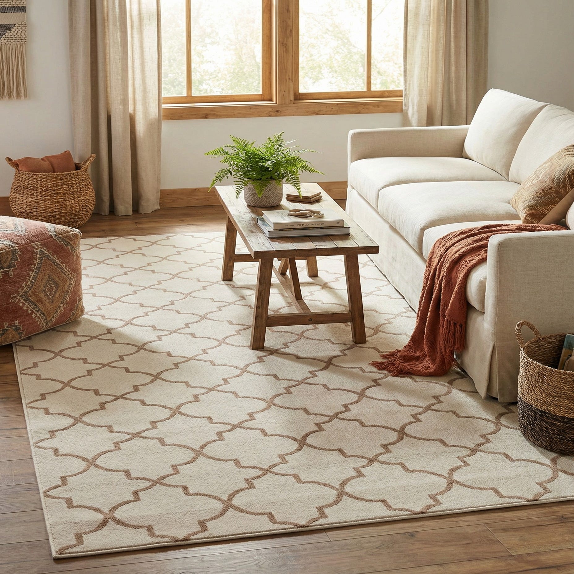 A clean white ground sets a calm backdrop for a repeating beige arabesque trellis that creates an airy, geometric rhythm across the surface. The motif is rendered in a slightly raised cut-pile against the low-profile field, so you can feel a soft, subtle texture underfoot while the neutral palette keeps the look light and versatile. Machine-made from 70% polypropylene and 30% polyester, the rug has a smooth hand with a gentle sheen that reads well with both modern and more traditional furnishings.