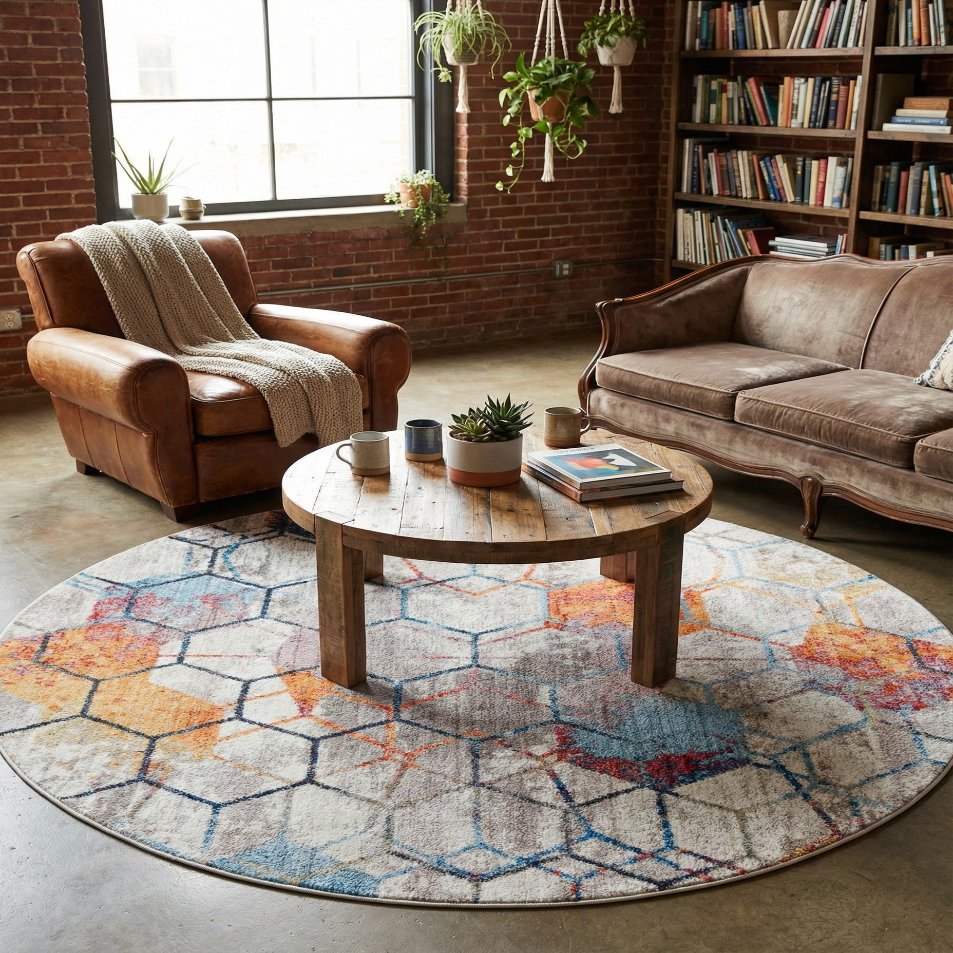 This round design works well anchoring a conversation area or beneath a small dining set, and it pairs nicely with mid-century pieces, contemporary sofas, or mixed-material coffee tables. Use it to introduce color into a neutral scheme—navy and warm wood tones pick up the deeper hues—or layer it in an eclectic studio to tie together diverse patterns and finishes.