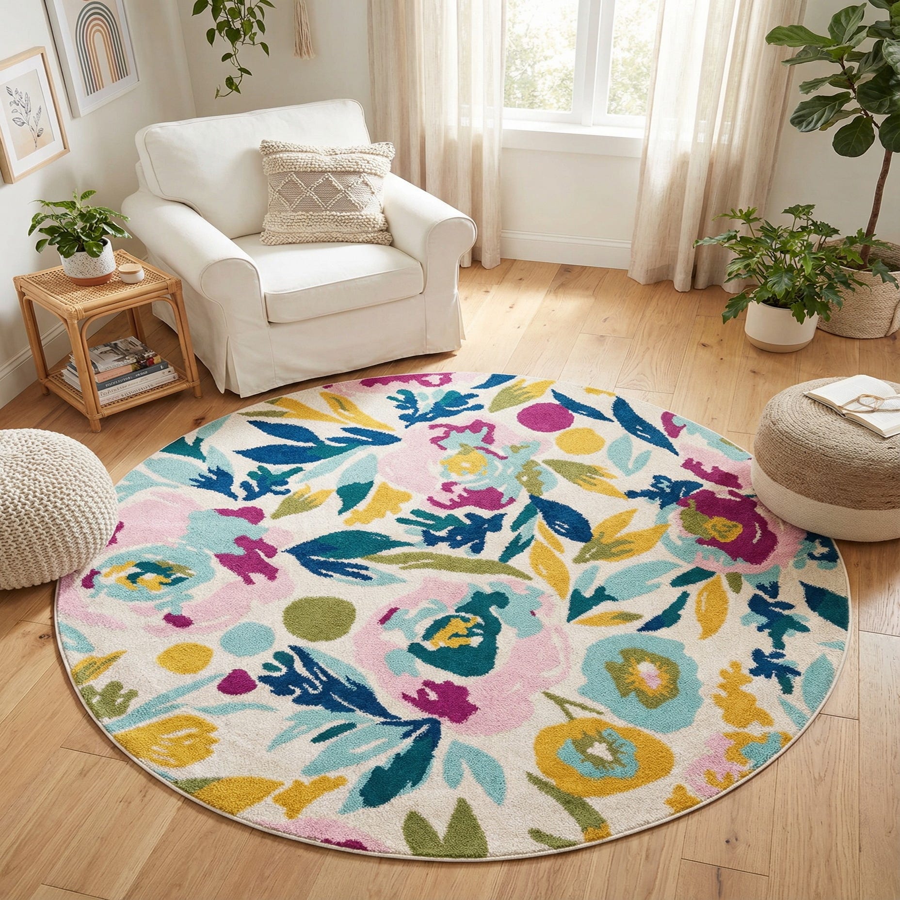 This round rug works well wherever you want a pop of color and a relaxed, modern-meets-cottage vibe: place it under a round breakfast table or in a sunny reading nook, use it to brighten a casual living room or bedroom, or add playful pattern to a child’s room or play area. Pair it with neutral upholstery and teal or navy accent pillows for cohesion, or layer it with woven textures and light wood furnishings to emphasize a breezy, contemporary look.