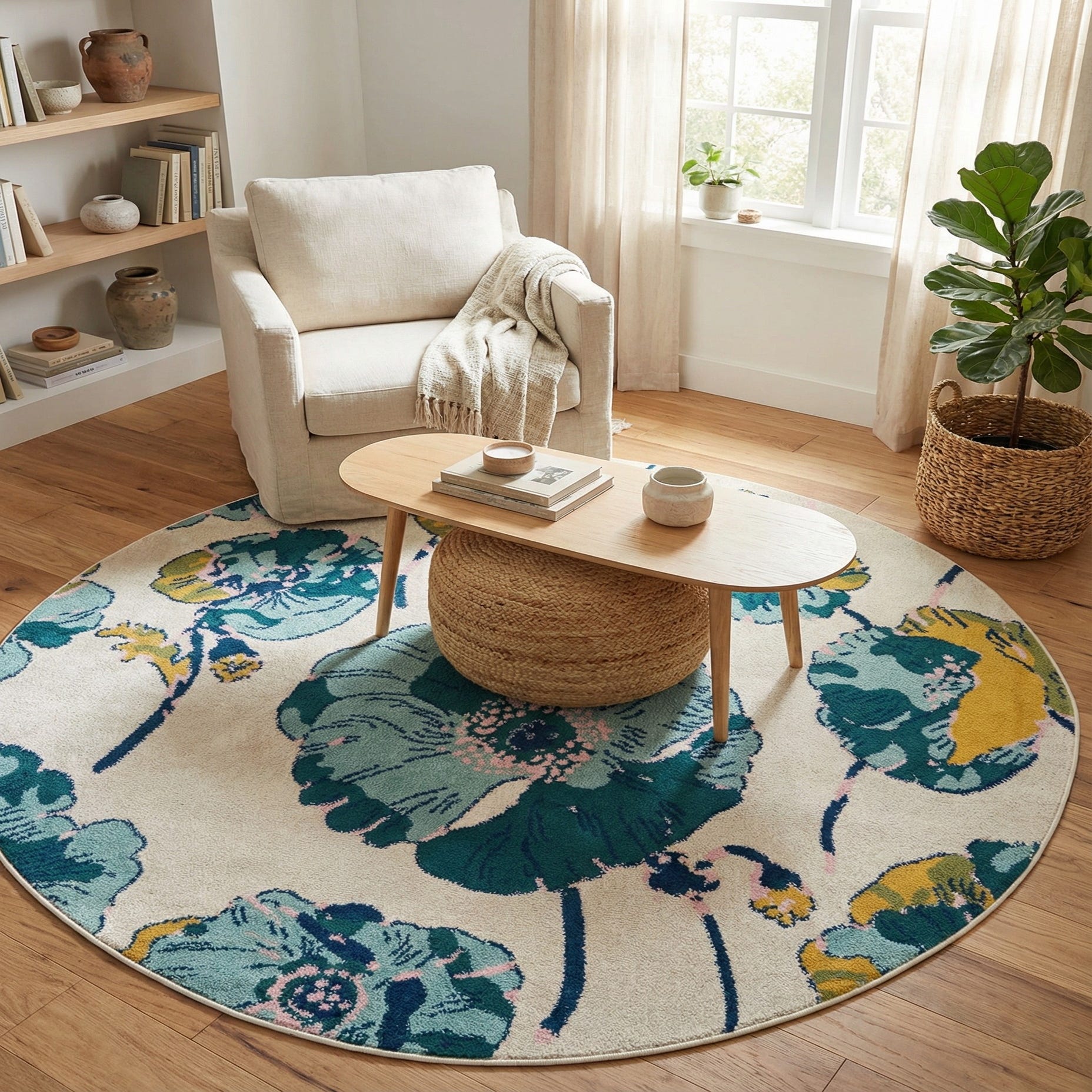 Machine made of 100% polypropylene, the rug offers the visual warmth of a floral area piece with practical performance for everyday use. It works well under a round dining table, as a focal point in a casual seating area, in a nursery or child’s room, or layered in a coastal or modern cottage interior. Pair it with light wood furnishings, navy or teal accent textiles, and small brass or matte finishes to echo the rug’s color story.