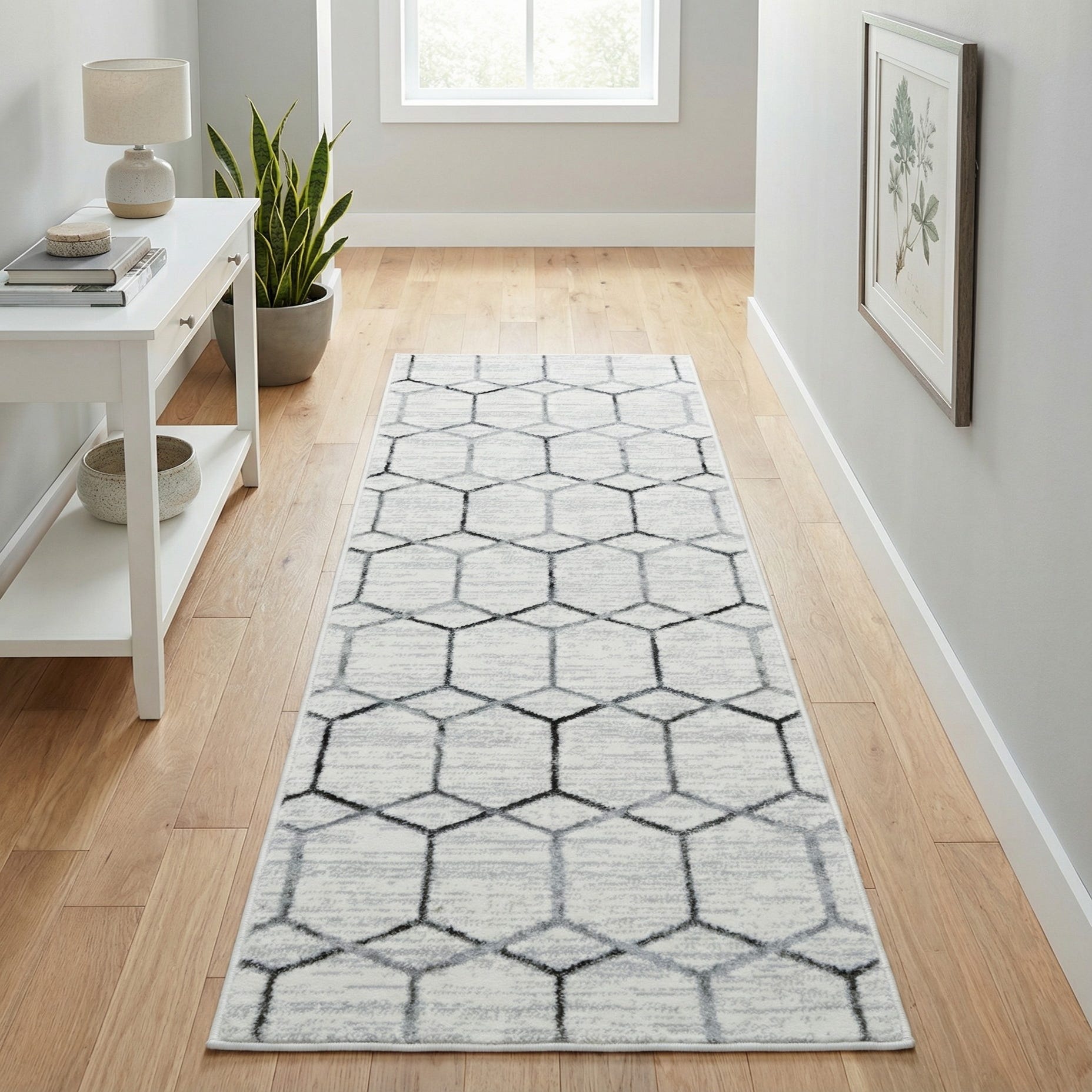 This runner works well in narrow spaces where you want visual interest without overpowering the room: think entryways, hallways, alongside a bed, or through a kitchen corridor. Its neutral white-and-gray palette pairs naturally with modern, Scandinavian, and transitional interiors, and complements light woods, painted cabinetry, or matte metal finishes. The pattern provides structure and rhythm, making it a versatile choice when you want a crisp, calm foundation for furnishings and decor.