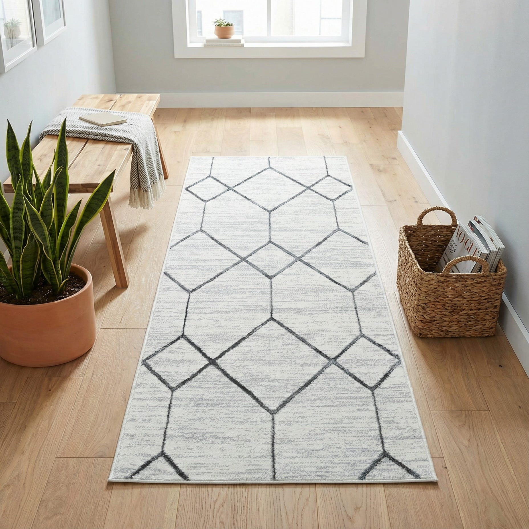 This runner works well in narrow spaces where you want a calm, modern touch—hallways, entryways, or alongside a kitchen island. Pair it with light wood floors and neutral furnishings for a Scandinavian or contemporary scheme, or use it to balance darker furniture and matte black accents in a transitional setting. The understated pattern provides graphical interest without overwhelming a room, making it easy to layer with rugs or keep as a streamlined anchor in your decor.