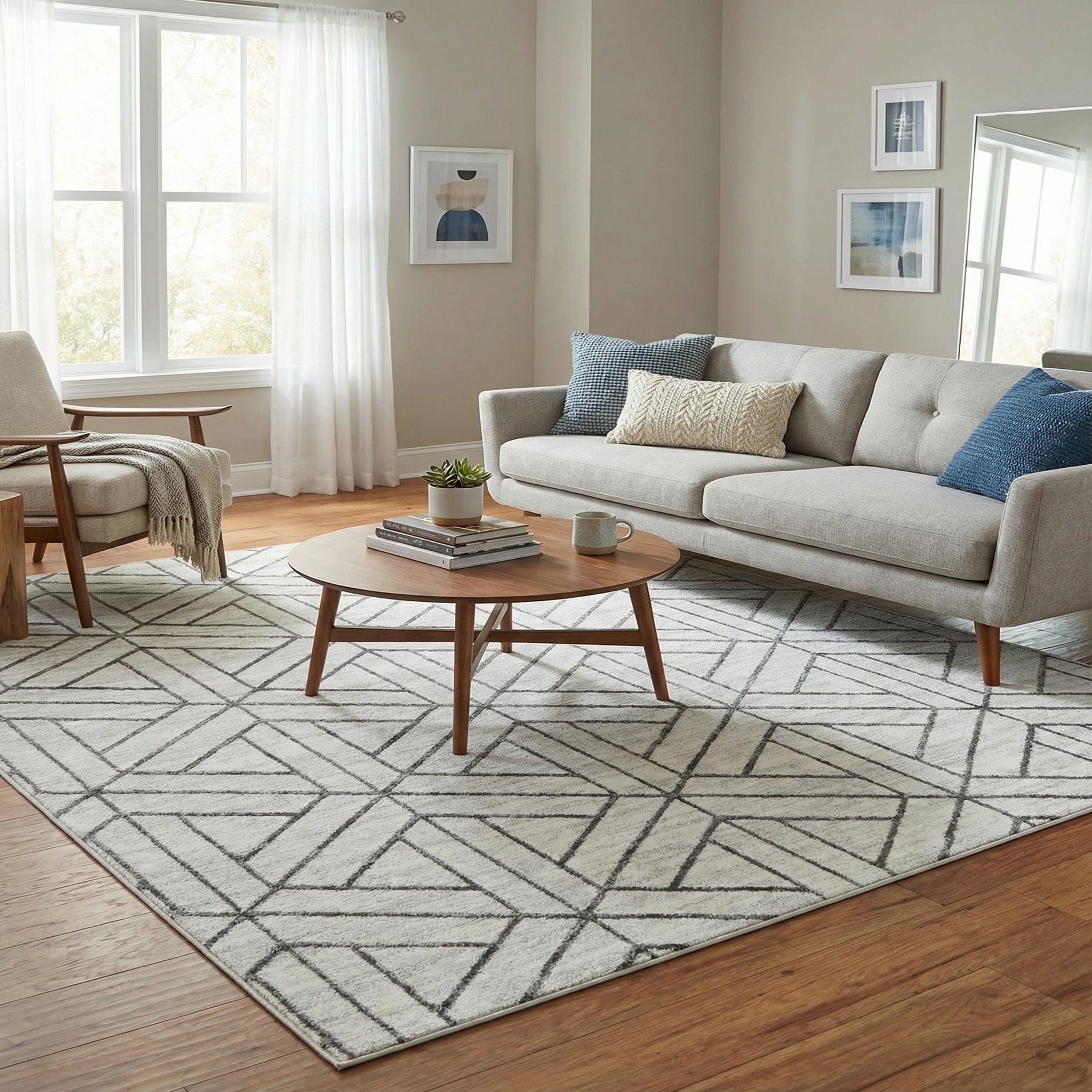 A 6'x6' square white modern rug with a dark gray geometric lattice trellis pattern, suitable for indoor spaces.