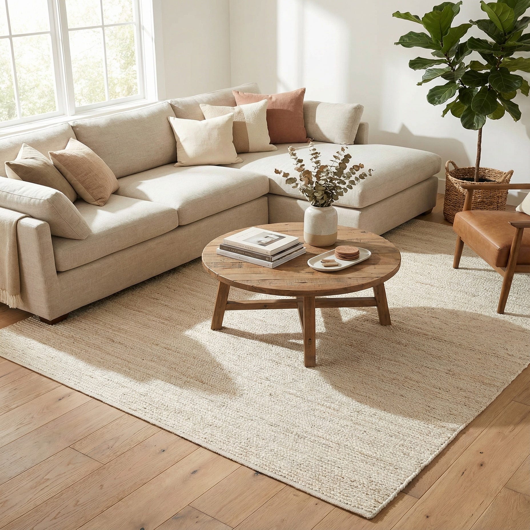 Its neutral palette and organic texture work well with coastal, modern farmhouse, Scandinavian, or minimalist interiors. Use it to anchor a light-wood dining set, soften a living room seating area with cool-toned upholstery, or layer it beneath a patterned rug in a bedroom or entry for added texture. Pair with linen textiles, woven baskets, and timber accents for a relaxed, cohesive look.