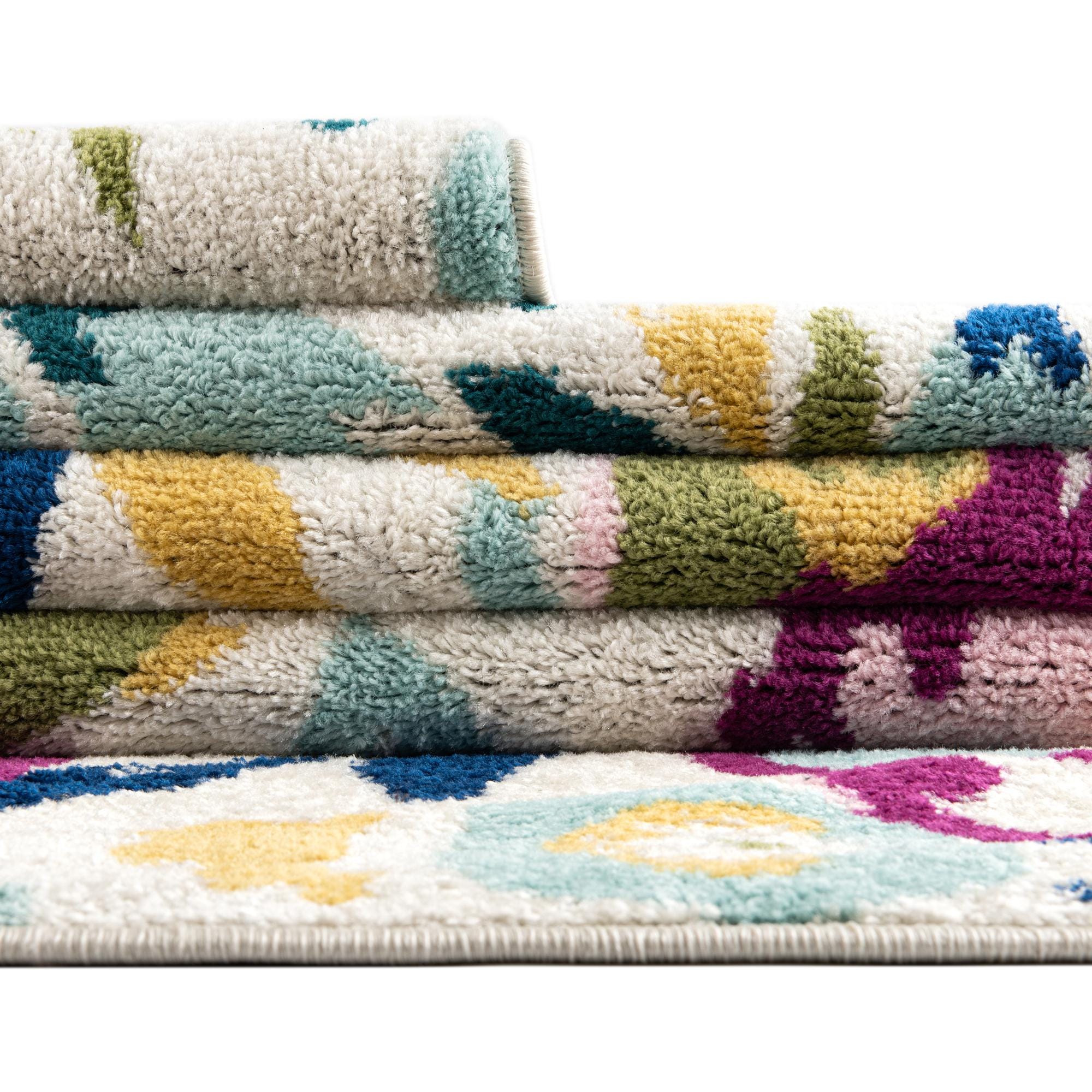 Primary color is White. Colors in this rug include: White, Green, Light Blue, Purple, Yellow, Teal, Pink, Navy Blue.