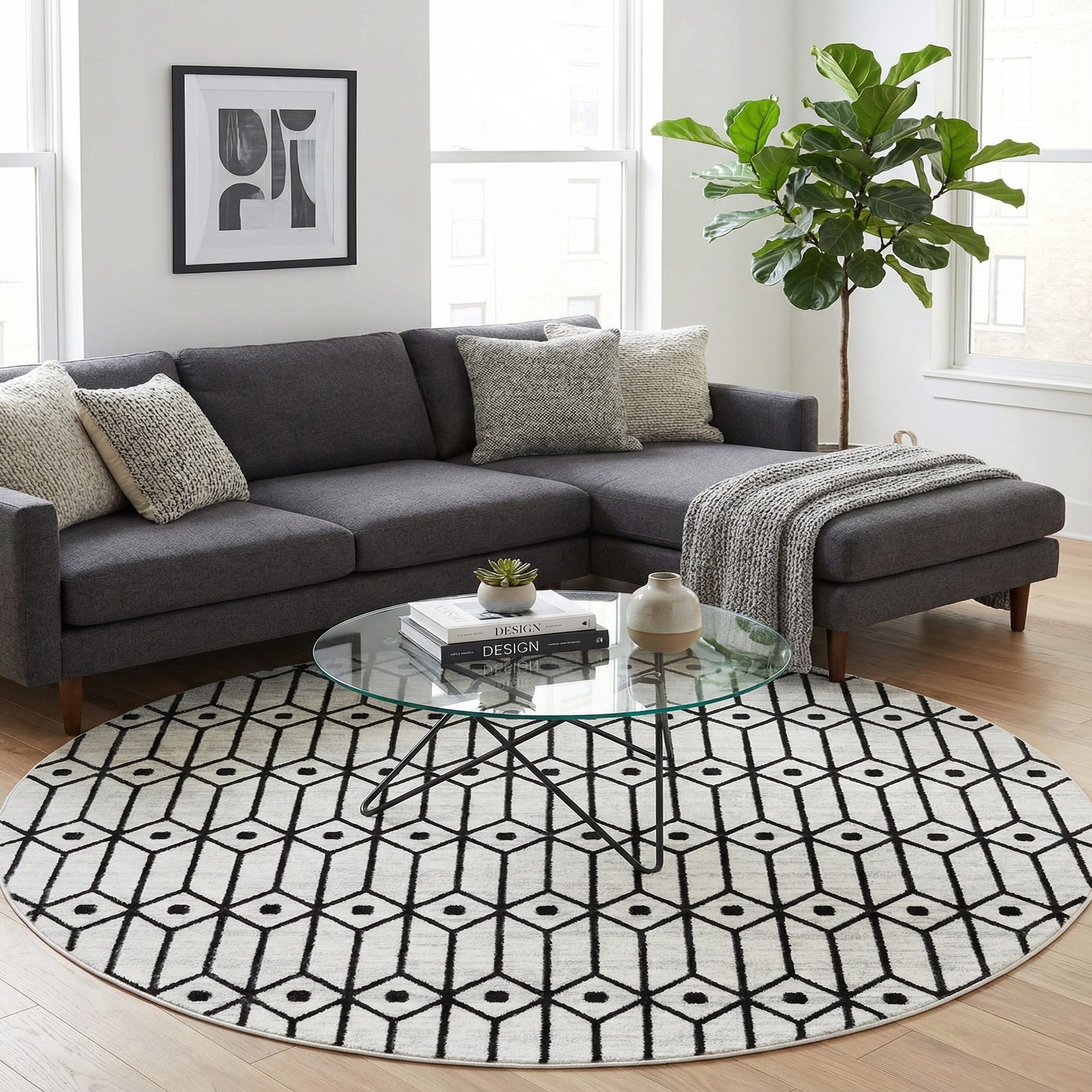 This rug works well in contemporary and transitional settings—place it beneath a round dining table to define the area, anchor a cozy reading nook, or layer it under an accent chair in a living room. Its neutral white-and-gray palette complements warm wood tones, metals, and colorful accessories, making it a versatile choice for adding pattern and structure without overwhelming a space.